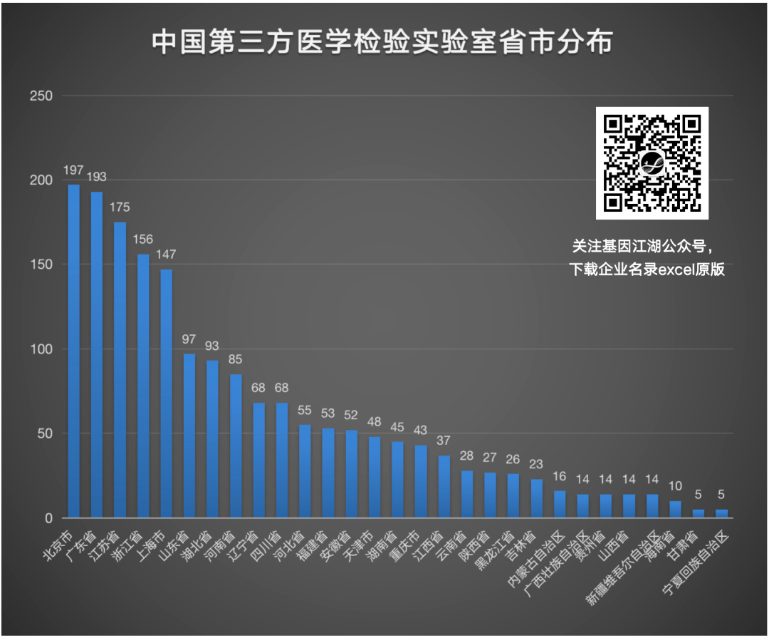 从实验室所属地域看,我国第三方医学检验实验室多分布在北京、广东、江苏、浙江、上海等发达城市。这与地区经济活跃、人口密集、医院数量众多、检测需求较大等因素密不可分。
