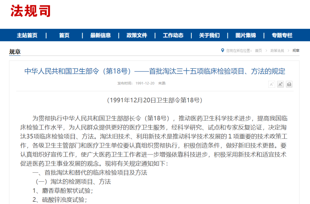 淘汰项目、方法及可替代的项目、方法:血清蛋白结合碘测定T3T4及其他甲状腺功能测定,黄疸指数测定,总胆红素测定,凡登白试验,直接胆红素测定,血清β一脂蛋白测定,甘油三酯、总胆固醇、高密度脂蛋白胆固醇测定,血清非蛋白氮测定,血清尿素氮测定,血红蛋白血液硫酸铜比重试验,血红蛋白测定,尿胆红素碘环试验,重氮法、尿试纸法、Harrison,血清(浆)葡萄糖铜还原测定法,葡萄糖氧化酶测定法、己糖激酶、邻甲苯胺法测定,血清丙氨酸氨基转移酶(ALT/GPT)金氏测定法,赖氏比色法、酶法测定,血清门冬氨酸氨基转移酶(AST/GOT)金氏测定法,赖氏比色法、酶法测定,血清白蛋白盐析测定法,溴甲酚绿结合法,血、尿淀粉酶温氏测定法,碘淀粉比色测定法、苏木杰比色测定法,血清梅毒克氏试验,性病研究实验室试验VDRL,血清梅毒康氏试验,不加热血清反应素试验USR,血清梅毒瓦氏补体结合试验,快速血浆反应素环状卡片试验RPR,尿妊娠蟾蜍试验,免疫学方法测HCG,血清钾四苯硼钠比浊测定法 火焰法、电极法测定,血清钠比浊、比色测定法,火焰法、电极法测定,血清甲胎蛋白对流免疫电泳法酶标法,血清甲胎蛋白单扩散法酶标法,乙型肝炎表面抗原对流免疫电泳法电泳法酶标法,乙型肝炎表面抗原单扩散法酶标法。国际上已废除的细菌名称 “全国临床检验操作规程”中规定的细菌分类名称,药敏试验中“轻度敏感”和“极度敏感”的报告方式采用“耐药”、“中度敏感/中介度”、“敏感”3个等级报告方式,血红蛋白沙利氏目测法(县及县级以上医院淘汰)氰化高铁血红蛋白测定法。35种检验项目和方法的淘汰,为检验科的生化检验带来了革命性的高速发展,在很短的时间里全自动、半自动生化分析仪迅速的在各级医疗卫生机构中得到了广泛的普及和应用。1995年卫生部下发卫药(1995)第32号“关于对四种体外免疫诊断试剂生产、销售、使用管理的补充通知”中,明确规定酶标试剂需用酶标仪判读结果,不得目测。从而使酶标仪和洗板机及一大批ELAS方法的试剂得到了有效的应用。2000年,卫生部颁发了(2000)412号文件,即《出血时间、凝血时间检验方法操作规程的通知》,在通知中对手工法(玻片法、毛细血管法)等法的出凝血相关检测项目进行了淘汰和规范。该文件的出台使我们的全自动、半自动的血凝仪在很短的时间里普及到了各级医疗卫生机构。2010年,卫生部,人社部下发12号文 、19号文,体检叫停了乙肝检测,在人社部发[2010]12号《关于进一步规范入学和就业体检项目维护乙肝表面抗原携带者入学和就业权利的通知》和人社部发[2011]25号《人力资源和社会保障部、教育部、卫生部关于切实贯彻就业体检中乙肝项目检测规定的》通知中,非常明确的叫停了招生招工招干等的乙肝病毒携带者检测,该政策的出台使我们原来靠乙肝检测满足检验科免疫室日常工作量和收入的量骤减,从而给我们的化学发光快速进入各级医疗卫生机构带来了机遇。