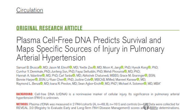 由美国国立卫生研究院(NIH)领导的一项研究表明,可以通过对血液中的细胞游离DNA(cfDNA)进行检测,从而实现对肺动脉高压(PAH)患者的疾病严重程度的测量。 肺高压又称肺动脉高压(Pulmonary hypertension,简称PH或PHTN),是描述肺循环内的压力升高的情形。肺高压会造成呼吸困难、晕眩、昏厥、下肢水肿,肺高压患者会因为心脏负荷增加令运动能力急速下降,以及发生其他症状,可引致心脏衰竭导至病患死亡。此症于1891年由恩斯特·冯·伦伯格(德语:Ernst von Romberg)首次描述。根据最新的分类,肺高压共有六种形式。 这项研究的结果表明,疾病更严重的患者往往有更高水平的cfDNA,这些cfDNA来自已知受疾病影响的相同类型的组织,这表明有一种细胞或组织损伤模式的地图,可以实现对特定疾病发病机制和疾病进展的无创监测。 此外,cfDNA监测可能允许在右心室功能障碍发展之前,更早地识别肺血管重塑和更早地开始治疗。 这篇文献于今年8月25日发表在《Circulation》杂志上。在这项研究中,研究人员比较了209名被诊断为PAH的成年人和48名作为对照的健康志愿者的cfDNA测量值,并发现较高的cfDNA与较严重的疾病相对应。 在对大多数参与研究的PAH患者的cfDNA检测浓度进行了分析后,作者发现,与对照组相比,在11种组织和细胞类型中,PAH患者的7种细胞类型明显升高。其中三种可用于按PAH风险区分患者:红细胞祖细胞、心肌细胞和血管内皮细胞。 NIH临床中心肺动脉高压科副主任、研究作者Michael Solomon说,甲基化分析显示,PAH患者的cfDNA浓度升高是由于已知受该疾病影响的细胞类型受损所致。 游离DNA(Circulating free DNA or Cell free DNA,cfDNA),循环游离DNA或者细胞游离DNA,是释放到血浆中的降解的DNA片段。cfDNA存在于人体的各种体液中,随组织损伤、癌症和炎症反应等发生浓度变化。母亲和胎儿-胎盘单位都会产生cfDNA,正常人体的cfDNA主要通过细胞凋亡过程中产生的小而均匀的185~200 bp小片段DNA。而肿瘤坏死的组织细胞由于非正常的凋亡过程,导至产生大小不同且大于200 bp的大片段DNA。循环中的cfDNA分子被迅速清除,半衰期为1小时或更短。 通常每年约有1000人患上PAH,其中三分之二是女性。大多数病例发生在没有这种疾病的已知家族史的人中。 PAH可能很难识别。患有这种疾病的人往往生活在与哮喘、慢性阻塞性肺病或心力衰竭等更常见的疾病相关的症状中,而且他们的疾病可能在正确诊断之前徘徊多年。 测量肺部血管和心脏压力的右心导管检查是PAH诊断和监测的金标准,而超声心动图可以是一个有用的替代方法。抽血对医生和病人来说更容易,而且适合的cfDNA模式可以帮助医生更快得出诊断。 美国国家心肺和血液研究所的应用精确全能学实验室主任,共同作者Sean Agbor-Enoh说,多家公司制造的诊断平台能够进行血液测试。但NIH的研究人员需要进一步验证他们的发现,并将cfDNA测量结果转化为对临床医生有意义的结果。 该测试将开展大规模试验进行验证,看起是否真的对患者有益,如果对患者有益,那么才具备商业化的可能性,并且获得投资回报。 约翰霍普金斯大学肺动脉高压项目主任Paul Hassoun说,多发性硬化症患者在没有治疗的情况下往往存活不到三年,当他们寻求医疗护理时,大多数人已经是疾病的晚期。如果cfDNA测定在一个更大的队列中得到验证,它可能成为了解PAH患者病情严重程度以及他们的预测生存期是以月还是年来衡量的检测组合一部分。 尽管约翰霍普金斯大学的PAH患者是参与者之一,但Hassoun教授没有参与这项研究。 研究结果中描述的cfDNA测定可能有助于诊断高风险人群的疾病,如硬皮病或其他结缔组织疾病患者。但这种疾病最严重的形式有一个未知的原因,他怀疑这种测试是否会帮助医生在更广泛的人群中更早地诊断出病例,除非进一步的测试显示它能将PAH与其他肺部疾病或其他类型的肺动脉高压区分开来。 Solomon在回应中说,他和Agbor-Enoh正在计划研究,以帮助解决区分PAH和其他疾病的问题,他希望接下来研究cfDNA水平及其在不同肺动脉高压群体中的来源。 Hassoun还指出,NIH研究中的另一个数字也显示,一些对照组血液中的cfDNA水平与高危PAH患者的水平重叠了。NIH的研究人员在回复中写道,许多测试都有这样的重叠,不同的测试有不同程度的灵敏度和特异性。 研究小组今年宣布了扩大cfDNA或RNA用于其他条件的发展,包括预测怀孕并发症,识别肿瘤亚型,检测干细胞移植并发症,以及开发设备以加强cfDNA采集技术。 |