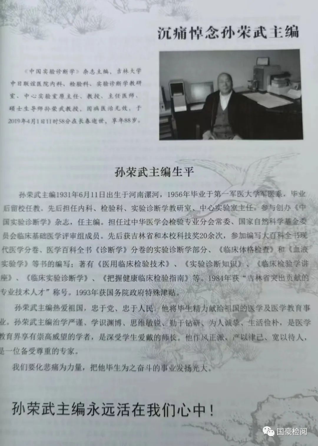 先生的病情发展很快,我回北京不到三个月,突然有一天收到了先生女儿发来的信息——2019年4月1日上午,88岁的先生走了!先生走的突然,我电话告诉了先生的至交王鸿利教授,当时王鸿利教授做了心脏手术,行动不方便,我说您好好休息,就不用来了,我替您买个花圈放在先生灵前。遗体告别的那天早上,我早早地赶到现场,看见了先生的灵柩,碰到了很多老熟人。北国的春天乍暖还寒,人们从四面八方赶来送别先生,胸前的小白花在寒风中颤抖,当哀乐响起、哭声呜咽的时候,敬爱的孙先生已经永远地离开了我们,离开了他生活过的这片土地,离开了他一生挚爱的检验医学事业。