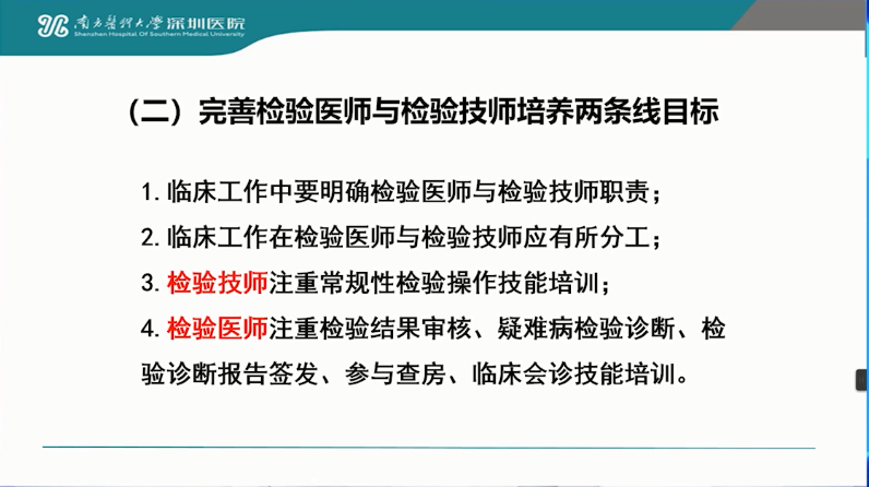 而这之中,最重要的是要“完善检验医师与检验技师培养两条线的目标”。将检验技师与检验医师区别开来。在临床工作中要明确检验医师与检验技师的职责;在临床工作中检验医师与检验技师应有所分工;检验技师注重常规性检验操作技能培训;检验医师注重检验结果审核、疑难病检验诊断、检验诊断报告签发、参与查房、临床会诊技能培训等内容。