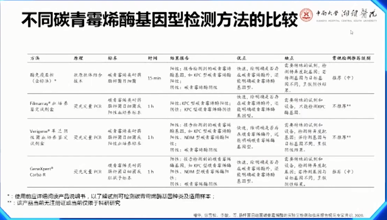 西安交通大学第一附属医院的耿燕教授一直致力于推动国内血流感染CRE实验室检测的搭建工作。在她的讲座《致命威胁,一“碳”究竟——血流感染CRE与CR—hvKP的辨识》内容中,总结改良了碳青霉烯类抑制法(mCIM):挑取试验菌株(1ul接种环)、悬于加美罗培南纸片(10ug)、孵育4h、E.coli ATCC25922接种MHA平板,用于纸片扩散法、悬液中取出美罗培南纸片、美罗培南纸片放在E.coli密涂平板上、孵育过夜、读抑菌圈。
