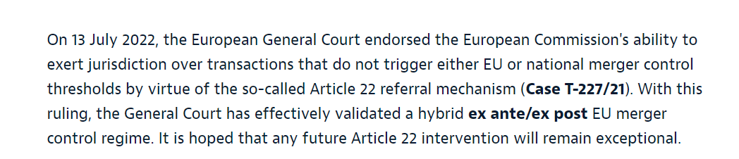 这是不久前刚赢了FTC一局之后春风得意的Illumina意料之中的一次打击(见这里),特别是关注咱们号的股东,自然知道这在我们的推演之中。 那么,我们稍微深入一点,谈点其他相关的内容。 欧洲普通法院 在新闻稿里有这么一段: Illumina is separately appealing a July 2022 decision by the General Court of the European Union regarding the European Commission's jurisdiction to challenge the GRAIL deal. 那么这个上诉诉的是啥? (欧洲普通法院) 早在2021年4月28日,Illumina就向欧洲普通法院(不知道翻译的是否准确哈)提起了诉讼,主要要求: 1:判令撤销欧盟委员会的关于禁止Illumina实施集中(收购GRAIL)的决定; 2:诉讼费用由欧盟委员会承担。 其主要的依据是其并未触犯欧盟的经营者集中申报制度,因此欧盟委员会的禁令应该是无效的2,案件编号T-227/21。 2022年7月13日,欧盟普通法院做出裁决,认为虽然Illumina收购GRAIL即便没有触发经营集中申报制度,欧盟委员会仍然有管辖权2。 原文太长,有篇解读虽然也很长看标题就差不多理解了3 有兴趣的可以去读下原文,反正就是自己人帮自己人了。 这就给欧盟委员会在9月6日做出限制令扫清了障碍。当然对于这个裁决Illumina肯定表示了上诉。 欧盟委员会的视角 欧盟委员会的新闻稿4表述与Illumina有些不同,有兴趣的看原文,没兴趣的我总结下重点: