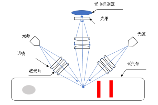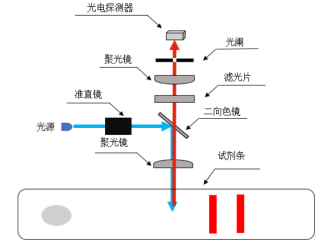 最近一个月,好几位朋友先后跟我询荧光免疫分析仪,都说需求量很大,要求也很一致——尽量便宜,在核算评估的过程中,我也把这员老将捋了一下。 免疫荧光分析仪问世至今近四十年,基本原理没有什么变化,技术上已经是非常成熟了。2021年底到2022年初的国内新冠抗原热潮,包括华大在内的三家企业独辟蹊径的选择了荧光免疫路线,一度引起热议。 免疫荧光技术的原理是在硝酸纤维素膜的测试区(T)包被 BSA 与抗原的偶联物,标记垫上含有预先包被的荧光标记抗体。 免疫层析原理示意图 检测时,首先用处理试剂将样本中的抗原与标记垫上的荧光标记抗体发生结合,形成免疫复合物,复合物在层析作用下沿着硝酸纤维素膜向前扩散至包被有另一种单克隆抗体的检测区,从而形成双抗体夹心复合物,而游离的荧光抗体则附着在质控区。当检测卡插入荧光免疫分析仪后,光源照射到检测卡上,通过模块控制LED的发光强度以符合测量的强度要求,分析仪自动扫描检测区和质控区的荧光强度,传感器输出信号经放大和滤波处理后,进入转换芯片转化为数字信号交给处理器进行处理,通过两种荧光强度的比值计算待测样本中的抗原含量。 免疫荧光分析技术具有灵敏度高、特异性强、耗材保存简单、操作简便等特点,在床旁即时检测(POCT)领域应用广泛,比如检测病毒、激素、毒品、C- 反应蛋白、糖化血红蛋白、甲胎蛋白、降钙素原等。 本篇介两款低成本、高灵敏的便携荧光免疫分析仪。其主要由光学检测部分、硬件部分、系统软件以及机械结构部分构成。 从模块上划分,有显示模组、硬件控制模组、采集以及插卡机构、打印模组、外壳、电池等。 光学检测部分是免疫荧光分析仪的核心,在光学暗箱结构中,由光源、激发光路、采集光路、光电传感器、放大系统等组成。 光源产生与荧光标记物的吸收波长相近的单色光,单色光通过激发光路,照射在试剂条特定的扫描点上。扫描点附近的荧光物质受激发发射荧光,采集光路(也叫接受光路)将荧光收集并聚焦到光电探测器的有效接收靶面内。采集光路除了透镜实现聚焦功能外,还设置了滤光片来滤除非特定波段光的干扰。 光路有共聚焦光路和非共聚焦光路 共聚焦光路 非聚焦光路(V型光路)是比较低成本的一种光路,如图所示,两个相同的光源分别与试剂条水平面成 45°和 135°夹角,对称的激发光源经过透镜和滤光片等光学器件后,聚焦于试剂条平面形成光斑。激发出的荧光则沿着垂直于试剂条的光路通过滤光片、透镜等光学器件到达光阑,并被光电探测器采集。 非共聚焦光路(V型) 光电探测器接受光信号后,将荧光强度转换为微弱电信号。为了能够有效的测量微弱电信号的值,系统中的信号放大电路对电信号进行放大。之后模数转换器将电信号结果转换为数字信号并送给送到微处理器进行计算和定量分析。 V型光路结构简单、成本低,抗震能力强。不足的是杂散光和热噪声会大一些。 光源有激光光源、LED、氙气灯、汞灯、卤素灯等。 LED属于半导体照明光源,体积小、功耗小、驱动电路简单、响应频率高,比如常见的圆子弹头LED冷光源。 同时,为了保证光源的稳定性,大多采用恒流电源驱动方式。 光电传感器有光电倍增管(PMT)、雪崩光电二极管(APD)、硅光二极管(SiPIN)等。 雪崩光电二极管暗电流较小、体积小、灵敏度高、驱动电路简单,比较适合小体积的荧光免疫分析仪,它的原理是利用半导体中载流子的雪崩效应实现电流放大,这种放大能使信号在未被其它电路噪声干扰的情况下得到放大。 雪崩光电二极管 其次是硅光二极管,其具有十分敏感的光电效应,响应快,货源相对稳定。其内部核心是一个面积固定的 PN 结,在经过不同强度的光照后,能够产生不同大小的反向电流,且电流的大小与光强成正比。 硅光二极管 几种光电传感器的参数对比 滤光片方面,根据荧光波长,采集光路选用中心波长在610 ~ 620 nm、带宽在 10 nm 的滤光片(如下图);激发光路选用中心波长低于600nm的滤光片。 滤光片光谱图(苏州众为光电) (插播一下,临床输血小编老邓目前在众为光电就职,找他!!!) 硬件部分采用上下位机的结构。上位机负责GUI显示、IC 模块通讯以及连接打印机;下位机主要完成测量功能,可连接多个通道,还包括控制各个通道的光源电路、电机控制以及光强检测。 上位机:以工控板为平台,操作系统、应用软件以及数据库运行在该平台上。应用软件用于与客户交互、接收操作指令、显示运行信息,并将测试步骤通过串口下发到下位机 ,获取下位机返回的测试数据后,应用软件计算出检测结果,检测结果可以通过打印模组打印出来,以及通过网口上传到 LIS 系统,数据结果也可以存储在本地。 下位机:MCU通过RS232与上位机通讯,下位机检测到微动开关信号后,发送指令通知上位机启动检测程序 ;获得上位机的检测参数后,下位机通过调整数字变阻器来调整光源亮度,通过电机控制与AD采样时序的配合,实现整个测试卡的扫描,并将扫描结果返回上位机处理 ;下位机还具有开机复位、废卡弹出以及光路异常报警等功能。 算法设计以C 反应蛋白项目为例,设定至少8组定标品测试,获得对应的测试值(具体测试用例略过); 通过测试,获取标准液的测试结果,并在二维坐标上描点形成散点图,建立回归模型,求出回归方程,然后进行线性函数的回归分析,得到