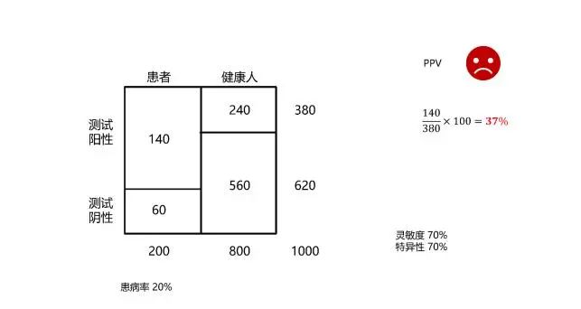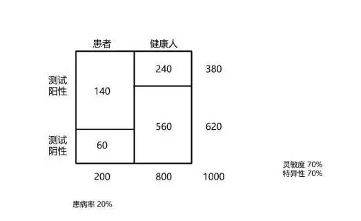 除了患病率外,还有一个变量对阳性预测值(PPV)有很大影响。这个变量被称为特异性。 这里有一个例子。让我们来看看一个有1000人的人口。假设患病率为20%,因此200人有这种疾病,800人没有。测试的灵敏度是70%,特异性也是70%。因此,在200个病人中,70%,即140人,将被测试发现,而60人将被遗漏。 同样地,70%,即560个未患病的人将被发现,而240人将被错误地归类为患病。总的来说,我们有380人检测结果呈阳性--140个真阳性,240个假阳性。 图1 | 在1000人的人口中,一种流行率为20%的疾病将影响200人。一个具有70%灵敏度和70%特异性的测试将正确识别140个患病的人和560个没有患病的人。这将留下60个假阴性和240个假阳性的结果。 现在我们来计算一下PPV。140个真阳性结果除以380个测试阳性者,乘以100,等于37%,这结果相当糟糕。 图2 | 对于20%的疾病流行率,在这个人群中使用灵敏度和特异性均为70%的测试,可产生37%的阳性预测值,或PPV。 如果我们使用一个灵敏度更高的测试,会发生什么? 现在让我们看看,如果我们把灵敏度改为90%,阳性预测值会发生什么变化。现在,在200个病人中,我们将挑选出180人,我们将错过20人。没有患病的人没有变化,因为特异性保持在70%。所以总的来说,我们最终会有420人检测出阳性。 PPV的计算方法是180除以420,乘以100,等于43%。因此,与我们最初的37%相比,没有大的改进。 图3 | 对于20%的疾病流行率,在这个人群中使用灵敏度为90%、特异性为70%的测试,产生的阳性预测值(PPV)为43%。 如果我们使用一个特异性更高的测试,会发生什么? 现在,让我们看看如果我们采用最初的数字,并将特异性从70%改为90%会发生什么。在这种情况下,患病的人数和他们的结果保持不变,因为灵敏度保持在70%不变。现在我们正确诊断了90%的非患者,即720人,我们将得到80个假阳性。 所以总的来说,有220人检测为阳性。阳性预测值是140除以220,乘以100,等于64%。这比我们最初的37%要好得多! 图4 | 对于20%的疾病流行率,在这个人群中使用灵敏度为70%、特异性为90%的测试,产生的阳性预测值为67%。 为什么特异性对阳性预测值的影响比灵敏度大得多? 嗯,因为在正常人群中,健康人组有更多的人。因此,正确识别为阴性的健康人个体数量的1%变化,即特异性,比正确检测为阳性的疾病个体数量的1%变化(即灵敏度)的影响要大得多。 |