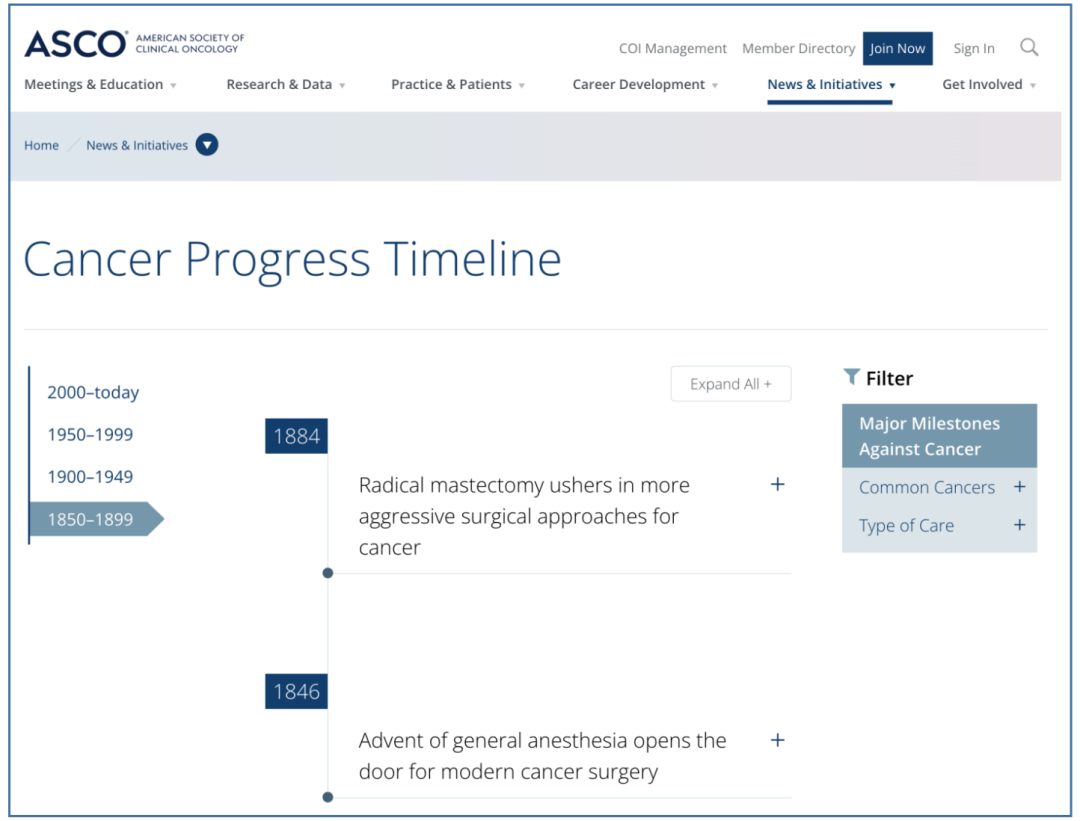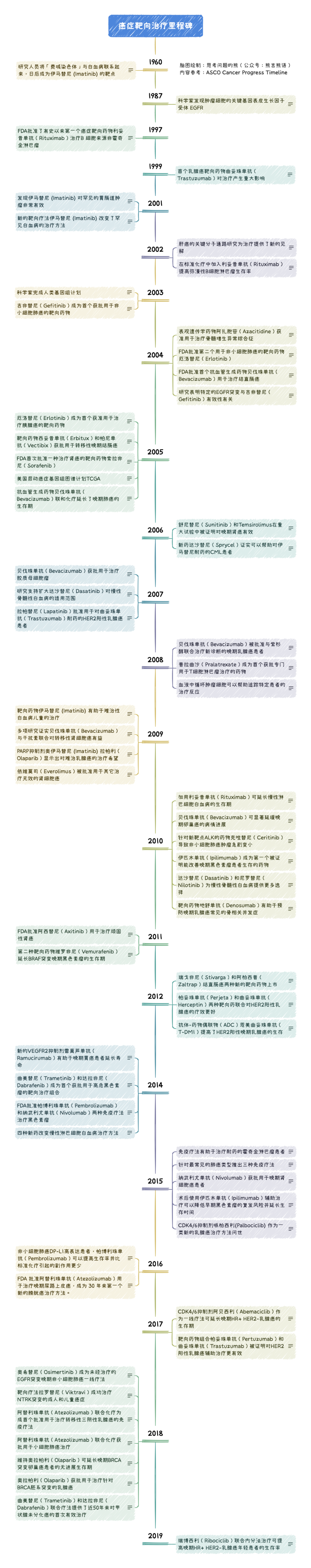 或许是为了纪念他们的国家癌症法案颁布 50 周年,ASCO 官网专门建立了一个叫做 Cancer Progress Timeline 的页面: https://www.asco.org/research-guidelines/cancer-progress-timeline 这个抗击癌症里程碑的进展时间表提供了癌症主要进展的历史概述,记录了跨越 170 年的 400 多个里程碑。从 19 世纪中期全身麻醉的出现为癌症手术打开大门,到 2017 年 FDA 批准了第一个癌症基因疗法。时间线内容突出了癌症治疗和研究领域的一些最重要的进展,几乎所有的里程碑都是严格进行的临床试验结果。我挑选其中靶向治疗相关内容进行学习梳理后有了今天这篇文章。如果你觉得这篇文章太长不看,可以直接保存下面这张图 接下来就让我们一起开始这趟跨越70年的癌症靶向治疗的里程碑回顾。对了,如果能耐心看到文末还可以找到为你准备的一个彩蛋。