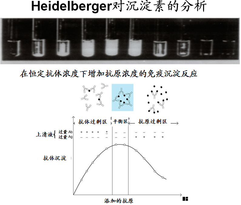 在抗原浓度和被沉淀的抗体间关系的一般形式,参见图4。经常被称为“Heidelberger-Kendall曲线”,可分为三个不同的区域: