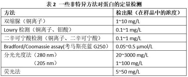 不同的非特异方法对蛋白质的定量检测,可参见表2。