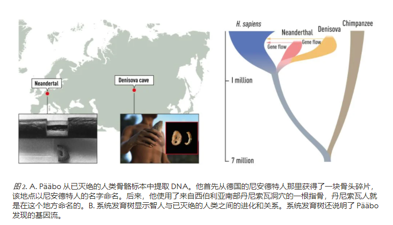 表彰他对已灭绝古人类基因组和人类进化的发现 人类一直对它的起源很感兴趣。我们来自哪里,我们与先人有什么关系?是什么让我们 智人与其他人类不同? 通过他的开创性研究,Svante Pääbo 完成了一件看似不可能的事情:对尼安德特人的基因组进行测序,尼安德特人是当今人类已灭绝的近亲。他还轰动地发现了以前不为人知的古人类丹尼索瓦。重要的是,Pääbo 还发现, 在大约 70,000 年前迁出非洲之后,这些现已灭绝的古人类向智人转移了基因。这种古老的基因流向现代人类在今天具有生理相关性,例如影响我们的免疫系统对感染的反应。 Pääbo 的开创性研究催生了一门全新的科学学科。 古基因组学。通过揭示将所有活着的人类与已灭绝的人类区分开来的遗传差异,他的发现为探索是什么使我们成为独特的人类奠定了基础。 我们来自哪里?我们的起源以及是什么让我们与众不同的问题自古以来就一直吸引着人类。古生物学和考古学对于人类进化的研究很重要。研究提供的证据表明,解剖学上的现代人类 智人 大约在 30 万年前首次出现在非洲,而我们已知的最近亲属尼安德特人在大约 40 万年前到 3 万年前在非洲以外地区发展并居住在欧洲和西亚,此时他们灭绝了。大约 7 万年前,一群 智人 从非洲迁移到中东,然后从那里传播到世界其他地方。 智人 因此,尼安德特人在欧亚大陆的大部分地区共存了数万年。但是我们对我们与已灭绝的尼安德特人的关系了解多少?线索可能来自基因组信息。到 1990 年代末,几乎整个人类基因组都已测序。这是一项相当大的成就,这使得后续研究不同人群之间的遗传关系成为可能。然而,研究当今人类与已灭绝的尼安德特人之间的关系需要对从古代标本中回收的基因组 DNA 进行测序。 看似不可能的任务在他职业生涯的早期,Svante Pääbo 对利用现代遗传方法研究尼安德特人 DNA 的可能性着迷。然而,他很快意识到了极端的技术挑战,因为随着时间的推移,DNA 会被化学修饰并降解成短片段。几千年后,只剩下微量的 DNA,剩下的部分被细菌和当代人类的 DNA 大量污染(图 1)。作为进化生物学领域的先驱艾伦威尔逊的博士后学生,帕博开始开发研究尼安德特人 DNA 的方法,这项工作持续了几十年。 1990 年,Pääbo 被慕尼黑大学聘为新任教授,继续从事古代 DNA 研究。他决定分析来自尼安德特人线粒体的 DNA——细胞中含有自身 DNA 的细胞器。线粒体基因组很小,只包含细胞中遗传信息的一小部分,但它存在数千个拷贝,增加了成功的机会。Pääbo 凭借他精巧的方法,设法从一块 40,000 年前的骨头中测序了一个线粒体 DNA 区域。因此,我们第一次获得了来自已灭绝亲属的序列。与当代人类和黑猩猩的比较表明,尼安德特人在基因上是不同的。 尼安德特人基因组测序由于对小线粒体基因组的分析只提供了有限的信息,Pääbo 现在承担了对尼安德特人核基因组进行测序的巨大挑战。此时,他有机会在德国莱比锡建立马克斯普朗克研究所。在新研究所,Pääbo 和他的团队不断改进从古骨遗骸中分离和分析 DNA 的方法。研究团队利用新技术的发展,使 DNA 测序变得高效。Pääbo 还聘请了几位具有群体遗传学和高级序列分析专业知识的关键合作者。他的努力是成功的。Pääbo 完成了看似不可能的任务,并在 2010 年发表了第一个尼安德特人基因组序列。比较分析表明,尼安德特人和最近的共同祖先 智人 生活在大约 80 万年前。 Pääbo 和他的同事现在可以调查尼安德特人与来自世界不同地区的现代人类之间的关系。比较分析表明,来自尼安德特人的 DNA 序列与来自欧洲或亚洲的当代人类的序列比来自非洲的当代人类的序列更相似。这意味着尼安德特人和 智人 在他们数千年的共存期间进行了杂交。在具有欧洲或亚洲血统的现代人类中,大约 1-4% 的基因组来自尼安德特人(图 2)。 一个耸人听闻的发现:丹尼索娃2008 年,在西伯利亚南部的丹尼索瓦洞穴中发现了一块 4 万年前的手指骨碎片。这块骨头含有保存得非常完好的 DNA,Pääbo 的团队对其进行了测序。结果引起了轰动:与尼安德特人和现代人类的所有已知序列相比,DNA序列是独一无二的。Pääbo 发现了一种以前不为人知的人类,它被命名为丹尼索瓦。与来自世界不同地区的当代人类的序列比较表明,丹尼索瓦和 智人之间也发生了基因流动。这种关系首次出现在美拉尼西亚和东南亚其他地区的人群中,那里的个体携带高达 6% 的丹尼索瓦 DNA。 Pääbo 的发现使人们对我们的进化史有了新的认识。在 智人 迁出非洲的时候,至少有两个灭绝的人类种群居住在欧亚大陆。尼安德特人生活在欧亚大陆西部,而丹尼索瓦人则居住在该大陆的东部地区。 在智人向非洲以外的扩张 和 向东迁移的过程中,他们不仅遇到了尼安德特人并与之杂交,还与丹尼索瓦人进行了杂交(图 3)。 古基因组学及其相关性通过他的开创性研究,Svante Pääbo 建立了一个全新的科学学科—— 古基因组学。在最初的发现之后,他的团队已经完成了对来自已灭绝人类的几个额外基因组序列的分析。Pääbo 的发现建立了一种独特的资源,被科学界广泛用于更好地了解人类进化和迁移。用于序列分析的新的强大方法表明,古老的人类也可能与 非洲的智人 混合。然而,由于热带气候中古代 DNA 的加速降解,尚未对非洲已灭绝古人类的基因组进行测序。 多亏