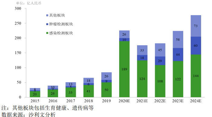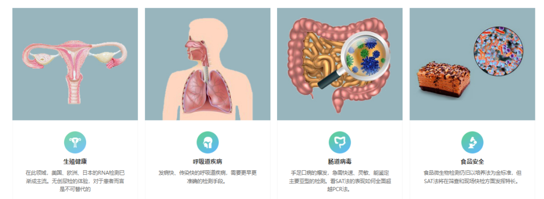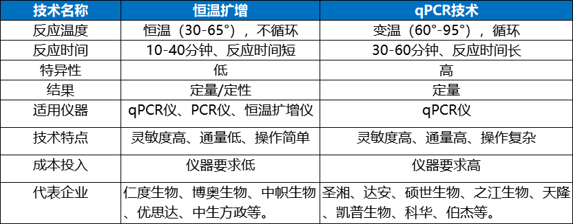 分子诊断市场分析 目前全球分子诊断市场规模不断增大,市场增速高于体外诊断市场平均增速。根据沙利文的报告,全球分子诊断市场规模:2019年约71亿美元,预计2024年市场规模将达到122亿美元,年复合增长率将达到 11.3%。其中,我国分子诊断市场规模:2019年约84 亿元,预计2024年市场规模将达到277亿人民币,2019-2024年的年复合增长率将达到27.0%。 2015-2024年全球与中国分子诊断市场规模分析 (仁度生物招股书) 按照分子诊断在临床的应用场景来看,主要分为感染检测、肿瘤检测、妇幼健康等领域,其中感染检测板块是最大的单一细分市场,包括血液传播疾病、HPV感染疾病、呼吸系统感染疾病和性传播疾病等领域,特别是新冠疫情的影响,感染检测在2020年-2021年呈现爆发趋势;而第二大市场为肿瘤检测且未来市场增速较快,主要是因为国人寿命的增加,发病人群基数大;其他板块主要是妇幼健康领域包括遗传病、生殖健康相关的检测。 2015年-2023年中国分子诊断市场规模 (仁度生物招股书) 在感染检测领域,目前临床上做核酸定量分析的技术主要包括qPCR检测技术、RT-PCR技术、RNA恒温扩增法等,主要是指通过检测DNA、RNA等物质来了解体内感染病原体的载量和基因型的变化。相较于 20 世纪 80-90 年代出现的DNA分子诊断,RNA分子诊断技术出现的时间更晚,目前市场认知度较低,在2019年,中国感染分子诊断领域RNA分子诊断(恒温扩增法)占比仅 6%。 感染检测技术介绍 qPCR技术的原理是通过控制温度的变化来实现DNA扩增,可表述为变性、退火、延伸三个步骤的循环,经过20-40个循环可扩增得到大量位于两条引物序列之间的DNA片段。PCR技术依赖于精良的仪器设备,不利于现场诊断试剂的开发和利用,使得以PCR为基础的核酸扩增检测技术无法更为广泛的推广和应用。RT-PCR技术是在qPCR基础上增加反转录的过程。 qPCR(聚合酶链式反应)技术的基本原理 RNA分子诊断是以RNA为检测靶标的分子诊断新技术,与传统DNA分子诊断技术相比,灵敏度更高,特异性更强,可以广泛应用于临床医学检测、血液筛查、食品安全检测和传染性疾病防控。因为RNA相较DNA检测的要求更高些,可以更好识别病原体在体内的活跃状态,是既往感染,还是近期感染。所以,在终端的收费,RNA检测收费相较于DNA检测的收费更高些。 部分省份恒温扩增或RNA检测收费 核酸恒温扩增技术是一系列能在某一恒定的温度下,应用不同的原理和方法,扩大特定DNA或RNA片段拷贝数的分子生物学技术的总称,属于核酸扩增技术(NAAT)范畴。核酸恒温扩增技术其独特的优势是反应不需要温度循环,在某一恒定温度下即可实现目标核酸序列的扩增。核酸恒温扩增技术的特点使它们对仪器的要求简单,反应的时间缩短。 恒温扩增与qPCR技术的区别与联系 恒温扩增技术可以分成两类,第一类是扩增反应依赖于特异性引物延伸;第二类是扩增反应依赖于限制性内切酶。 常见恒温扩增技术 在国内RNA恒温扩增技术之中,根据沙利文2019年数据,仁度生物SAT技术市场份额为34.8%;豪洛捷TMA技术(美国公司)市场份额为34.8%;武汉中帜T7 RNA 双扩增技术市场份额为10.5%。在国家药监局网站,通过“恒温扩增”关键字检索,NMPA获批的恒温扩增试剂盒简单统计如下: 企业代表 仁度生物 http://www.rdbio.com 上海仁度生物科技股份有限公司(股票代码:688193),成立于2007年,是国内最早一批专注于 RNA 恒温扩增技术和产品的生命科学企业之一,开发了 RNA 实时荧光恒温扩增技术平台(SAT平台),基于SAT技术的分子诊断产品可广泛应用于临床检测、血液筛查、食品安全检测、传染性疾病的应急防控和快速反应等多个领域。 分子诊断试剂盒种类 2017年推出全自动核酸提取仪(NAPure96)产品;2019 年推出公司核心仪器产品“全自动核酸检测分析系统(AutoSAT)”,AutoSAT是目前首台国产高通量、全自动、具有随到随检和急诊功能的RNA核酸检测分析系统。 豪洛捷 http://www.hologic.com.cn 豪洛捷于1985年在美国成立,总部位于美国马萨诸塞州波士顿市。1990年在美国纳斯达克成功上市(纳斯达克代码HOLX),作为全球领先的医疗、诊断及为女性健康提供全方位解决方案的公司,基于TMA恒温扩增技术,无需实验室分区,全自动化过程,样本进,结果出,可提供包括细胞学与HPV检测的宫颈癌筛查整体解决方案,以及高精度HBV、HCV和HIV病毒核酸定量检测方案。 Panther®全自动核酸检测系统 中帜生物 http://www.zhongzhibio.com 武汉中帜生物科技股份有限公司,位于武汉东湖国家自主创新示范区国家生物产业基地生物医药园,是一家专业从事分子生物检测及临床医学诊断新技术新产品研发、生产和销售为一体的医疗器械类高新技术企业,2011年成立,2016年挂牌新三板,2017年获得A轮融资。公司主打产品多重呼吸道病原体核酸检测试剂基于自有核心专利技术——T7RNA恒温扩增和多生物素信号放大相结合的双扩增技术进行开发。 双扩增技术检测流程 优思达 https://www.bioustar.com 杭州优思达生物技术有限公司(USTAR)是一家致力于创新POCT分子诊断产品研发、生产和销售的高新生物科技公司。公司拥有多项自主知识产权和快速分子检测技术平台,其中包括:恒温扩增技术、全封闭式目标片段核酸扩增物快速检测技术和试剂玻璃化技术,并已在此平台上开发了多种新型快速分子诊断试剂盒。 核酸检测自动化解决方案 博奥生物 https://www.capitalbiotech.com 北京博