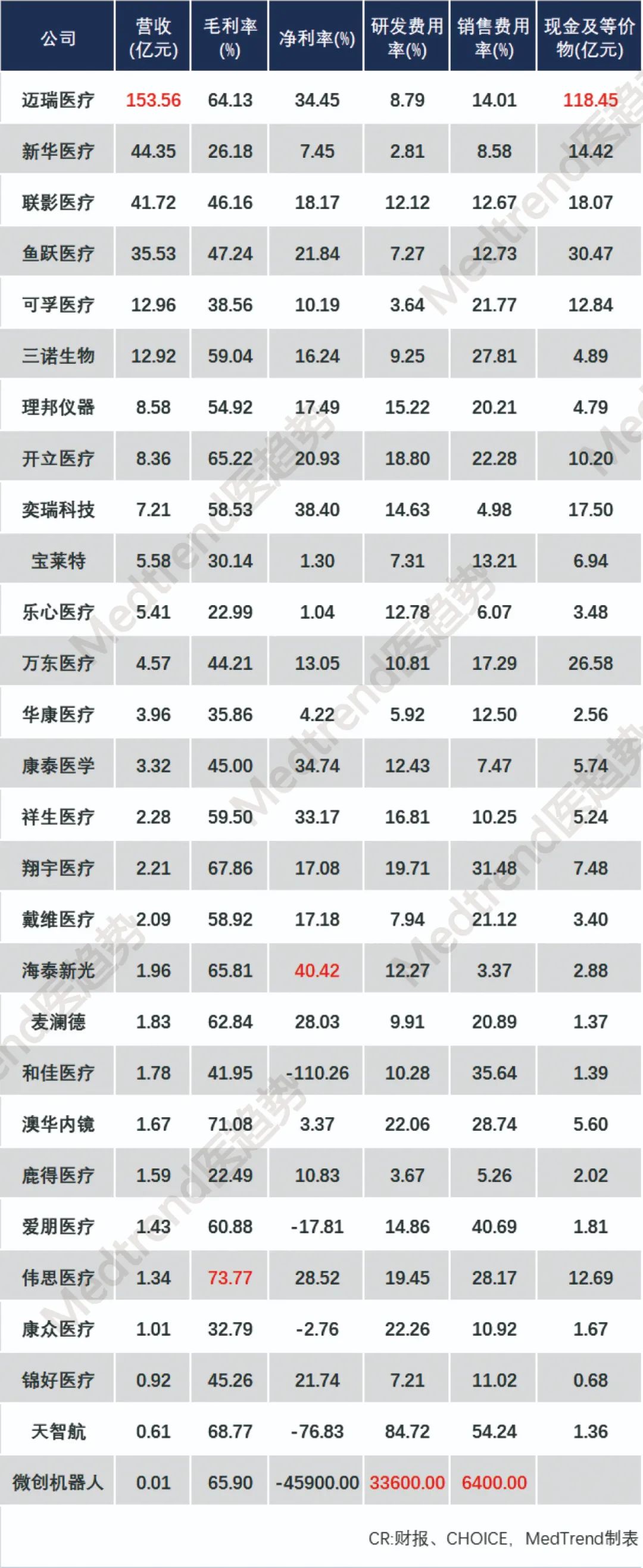 康泰医学产品主要包括:心电监护、血氧仪、超声、诊断试剂等。产品众多但是广而不精。2022上半年营收3.32亿元(-35.50%),净利润1.15亿元(-43.02%)。其净利率高主要源自其营业成本下降28%,销售费用下降10%。此前2020年8月,登录A股首日涨幅高达30倍而引发关注;随着业绩下滑,目前其股价已跌入历史最低。迈瑞医疗、祥生医疗产品都涉及超声,2022上半年,迈瑞超过了GE医疗,成为中国医疗超声市场TOP1,另一中国超声企业开立排名第五,而祥生医疗并未进入前十。祥生专注于超声产品,中国市场占有率未列入前十;2022上半年营收2.28亿元(+22.28%),净利润7573.59万元(+60.52%),其净利率高主要源自财务费用下降2573.28%。迈瑞作为中国医疗设备企业龙头,已经成为一家平台型企业,其产品覆盖生命信息与支持、体外诊断、医学影像三大领域,并形成了协同效应,且境内外业务均衡,2022上半年海外营收占比40%。在医疗设备领域,平台型企业更具备抗风险能力,产品技术创新企业形成的核心竞争力,也能更好带动盈利。而技术创新固然重要,但并不是研发费用率越高越好。从2022上半年数据可以看出,研发费用率前五的企业无论营收还是利润都位于下游。研发费用率前五:微创机器人(33600%)、天智航(84.72%)、康众医疗(22.26%)、澳华内镜(22.06%)、翔宇医疗(19.71%);销售费用率前五:微创机器人(6400%)、天智航(54.24%)、爱朋医疗(40.69 %)、和佳医疗(35.64%)、翔宇医疗(31.48%)。微创机器人和天智航是手术机器人领域唯二的上市公司。2022上半年微创机器人研发投入3.36亿(+110.16%)、销售投入0.64亿(+337.74%),一方面由于2022年是其手术机器人商业化元年,另一方面证明手术机器人产业非常“烧钱”。康众医疗、爱朋医疗、和佳医疗2022上半年都呈现亏损。- 康众医疗主营产品数字化X射线平板探测器;2022上半年亏损277.2万元(净利润-105.96%);总体来看在影像设备领域核心竞争力较差。