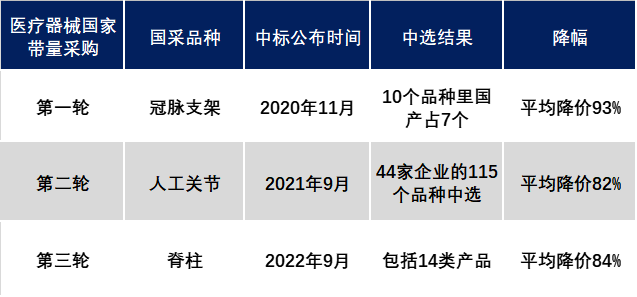 中国高值耗材上市企业近三年营收趋势 在高值耗材创新领域,一方面受制于研发费用和销售费用支出较多;另一方面心血管、骨科进入国家带量采购降价幅度大,利润亏损。这在一定程度上也影响了其营收增幅及销售净利率。- 2020年11月,国家带量采购在冠脉支架领域展开,平均降价高达93%,此后2021年9月又进行了人工关节国采,平均降价82%;因此高值耗材销售平均净利率也从2021年开始随之下降。2022年9月第三轮医械国采在脊柱领域公布中标结果。