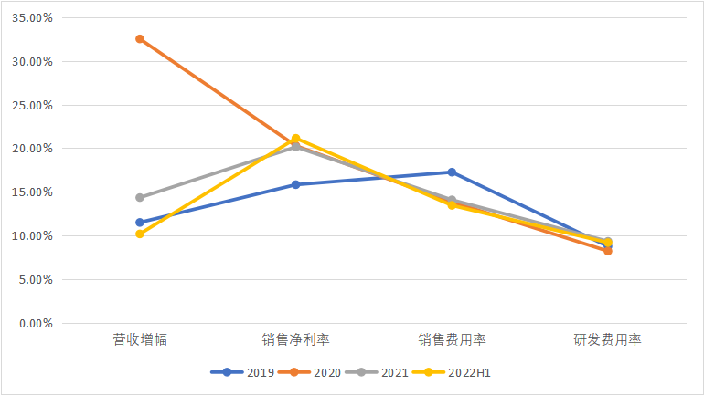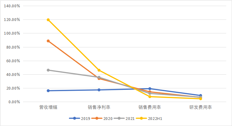 中国医疗设备上市企业近三年营收趋势 医疗设备通常来说技术壁垒较高,产品单价较贵,医疗机构采购周期较长,一般有“三年不开张,开张吃三年”的潜规则。此外,研发和销售投入较高,仅次于高值耗材,因此销售净利率在20%左右,低于高值耗材和IVD。2022上半年,随着中国疫情形势放缓,在疫情下高速增长的CT、呼吸机营收增速放缓。海泰新光、奕瑞科技主要为全球医疗影像设备企业提供关键零部件,因此,净利率高主要因为销售费用率分别以3.37%,4.98%位于医疗设备领域最低。2022上半年,- 海泰新光营收1.96亿元(+45%),净利润0.79亿元(+35.6%),海外营收占比75.67%;