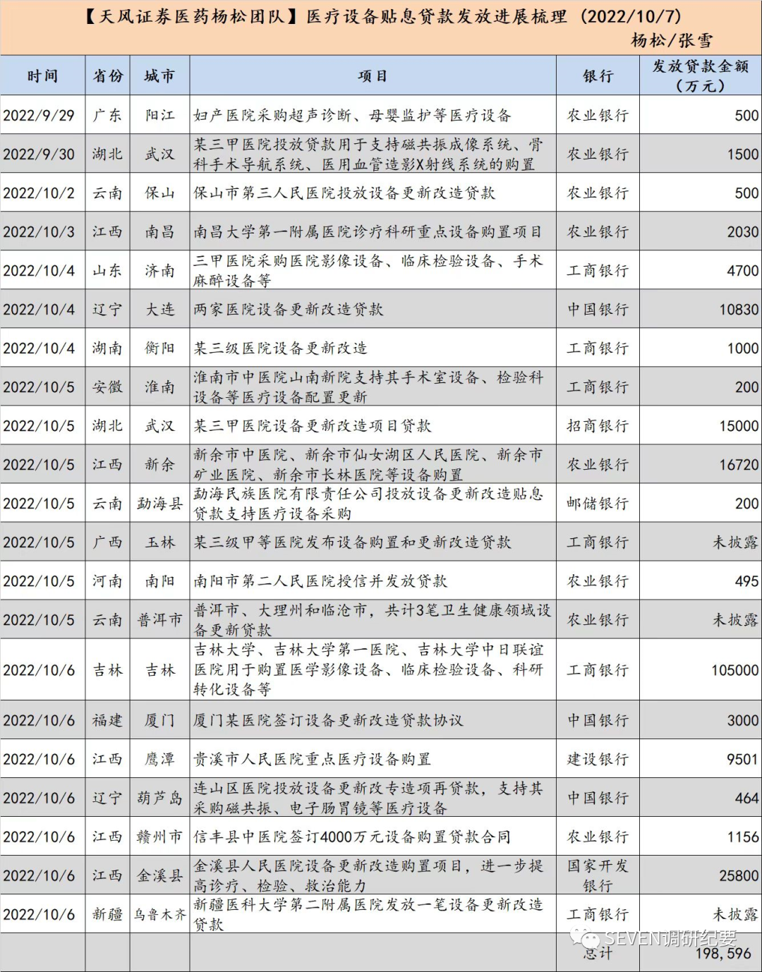 在2010年前后,卫生行业有文件规定医疗机构不允许贷款购买设备。在中央和地方财政投入不足的情况下,医疗系统的基建和设备购买面临巨大的资金缺口。这次贴息贷款政策一方面是促进消费,另一方面医疗行业疫情之后在方舱及新冠储备医院、急救能力建设、千县工程和区域医疗中心等方面有建设需求,原本有些项目有财政预算, 但由于疫情后财政预算吃紧迟迟没有落实。 而这笔钱填补医疗建设的资金缺口。