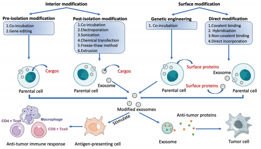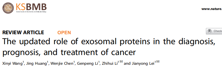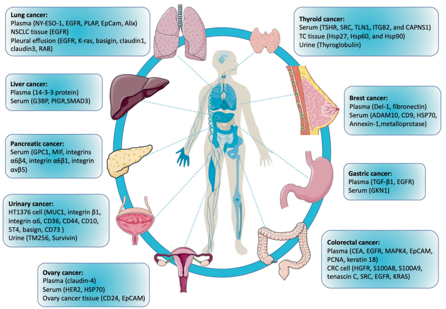 外泌体来自多囊泡体(MVB),在电子显微镜下呈杯状,直径为50至150 纳米。外泌体是由各种细胞自然分泌的,通常在体液中检测到,包括血液、尿液、腹水和唾液。外泌体“货物”包括核酸、蛋白质、脂类、酶和指示母细胞生理状况的代谢物。外泌体被认为通过与细胞膜直接融合、内吞途径和配体-受体相互作用在细胞-细胞通信中发挥作用。 肿瘤衍生(TD)外泌体由肿瘤细胞释放,并携带能反映亲代肿瘤细胞特征的物质。因此,外泌体可作为肿瘤诊断标记物。作为微环境中肿瘤细胞与非肿瘤细胞之间的重要通讯形式,外泌体在肿瘤发展的不同阶段发挥着重要作用,包括肿瘤相关免疫调节、微环境重建、血管生成、侵袭和远处转移。在不同类型和不同阶段的癌症中,外泌体蛋白的表达谱往往存在显著差异,这表明这些蛋白与癌症的发展和进展密切相关。此外,TD外泌体的其他功能也不容忽视,包括参与限制免疫调节和增强化疗耐药性,可能促进原发性肿瘤生长和转移。 近日,来自中国的研究团队在杂志Experimental & Molecular Medicine上发表了一篇题为“The updated role of exosomal proteins in the diagnosis, prognosis, and treatment of cancer”的综述文章。在这篇综述中,研究团队总结了外泌体蛋白对肿瘤发展的影响,强调了外泌体蛋白质在各种癌症中的诊断和预后作用,并说明了外泌体蛋白质在癌症治疗中的潜在应用。本综述旨在全面了解外泌体蛋白的生物学机制和临床价值,加深对外泌体蛋白在肿瘤发生和癌症进展中的作用的理解,并为进一步的应用和研究提供建议。 图片来源:Experimental & Molecular Medicine 一、外泌体蛋白及诊断优势 外泌体蛋白质要么封装在内腔内,要么嵌入外泌体表面,这使得基于表面生物标记物的外泌体亚型分类能够在不破坏其结构的情况下进行。由经历病理过程的细胞分泌的外泌体具有不同的成分,可作为其状态的标记。 与其他外泌体货物相比,外泌体蛋白质在癌症诊断方面具有以下优势:(1)外泌体蛋白在外泌体中稳定,半衰期长。此外,外泌体内的蛋白质可以直接作用于靶细胞,而核酸必须在发挥活性之前转录或翻译。因此,外泌体蛋白质的定量和定性数据可以提供比其他货物更准确的信息。(2) 与其他外泌体货物相比,外泌体表面蛋白可以在一个相对简单的分离程序后在较小的样本量中检测到。外泌体蛋白质可以提供丰富、稳定、敏感的和独特的信息。(3) 由于基于质谱的检测技术的进步以及数据收集和分析方法的不断优化,比较蛋白质组学的蛋白质覆盖率和灵敏度都有所提高,癌症患者尿液中的特异性外泌体蛋白可以检测到。蛋白质组学工具在外泌体研究中分析翻译后修饰的应用也增加了外泌体蛋白质组学数据在癌症发病机制、功能和疾病关联方面的深度。 外泌体表面蛋白及其作用。 图片来源:Experimental & Molecular Medicine 二、外泌体蛋白对肿瘤生物学的影响 外泌体蛋白与血管生成、上皮-间质转化、肿瘤微环境和耐药性 携带VEGF的外泌体可能对早期肿瘤血管生成至关重要。研究表明外泌体蛋白与血管生成和血管通透性相关,从而促进癌症进展。 在癌症中,上皮-间充质转化(EMT)是上皮细胞转化为间充质细胞的一个特殊过程。间充质细胞源性外泌体的蛋白质组分析显示,一些上皮生物标记物(如E-cadherin和EpCAM)减少,而间充质生物标记物(如vimentin)和蛋白酶(如MMP-1)增加。因此,需要彻底认识外泌体蛋白在EMT中的功能。 肿瘤细胞可以与肿瘤微环境(TME)内的各种类型的非癌细胞相互作用。作为细胞外环境的组成部分,组织源性外泌体在TME中启动ECM重塑的能力对肿瘤细胞的存活至关重要。外泌体蛋白除了对ECM重塑的影响外,还可以通过免疫调节影响TME。综上所述,外泌体蛋白对改变微环境的免疫调节有多方面的影响。 外泌体介导的多药耐药也是癌症发展的一个重要机制。其基本机制涉及外泌体介导的钙依赖性蛋白激酶激活和Raf/MEK/ERK级联。除此之外,外泌体还可以通过控制P-糖蛋白的表达将耐药多药耐药性传递给对敏感个体。外泌体蛋白被认为是耐药的重要介导物,进一步的研究表明外泌体蛋白在癌症治疗中的应用。 外泌体蛋白在癌症生物学中的作用。 图片来源:Experimental & Molecular Medicine 三、外泌体蛋白在人类癌症中的诊断价值 尽管外泌体的内容不断被重新定义,外泌体载体的优势和独特性已证明其作为肿瘤标记物的巨大潜力。位于外泌体表面或膜内的蛋白质也可以用作癌症生物标记物。与其他类型的外泌体货物(DNA、mRNA、miRNA、circRNA、lncRNA和代谢物)相比,蛋白质可以提供丰富、稳定、敏感和独特的信息。外泌体蛋白被报道为多种癌症的特异性诊断和预后因素,包括乳腺癌、泌尿系统癌症、肺癌、胃癌、肝癌、结直肠癌、卵巢癌、甲状腺癌和胰腺癌(如下图)。 多种类型人类癌症的外泌体蛋白生物标记物。图片来源:Experimental & Molecular Medicine 乳腺癌 在世界范围内,乳腺癌已成为女性中最常见的癌症。研究证明,ADAM10、金属蛋白酶、CD9、Annexin‐和HSP70在乳腺癌患者胸腔积液或血清中分离的外泌体中富集。Moon等人提出了fibronectin和Del-1在乳腺癌细胞源性外泌体中的诊断价值,AUC为0.961,敏感性为94.70%,特异性为86.36%。此外,血清中外泌体survivin‐B的独特表达模式被认为是早期乳腺癌的标志。与5年无病对照组相比,这些患者的血清外泌体survivin-2B水平显著升高