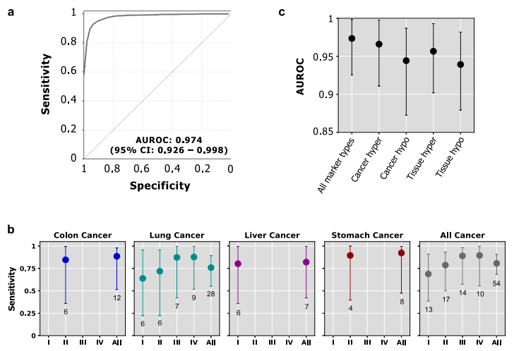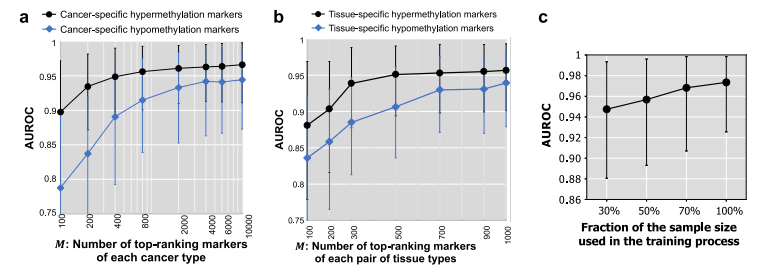 在癌症转移之前发现癌症是成功抗癌的关键。最近,无细胞DNA(cfDNA)因其在早期癌症检测中的实用性而受到关注。具体而言,cfDNA甲基化已被证明是一种非常有前景的特征,不仅能够检测癌症,而且能够定位其起源组织(TOO)。尽管它前景广阔,基于cfDNA的癌症检测面临着一些主要挑战:(1)早期癌症患者血液中肿瘤cfDNA的比例可能很低,(2)不同癌症类型、亚型、阶段和病因的cfDNA异常特征是异质的;(3)与疾病的多样性和患者群体(年龄、性别、种族和共病)相比,目前可用的样本量较小,尤其是对于泛癌检测而言。 为了应对cfDNA中肿瘤比例(tumor fraction)极低的挑战,甲基化组检测可以利用血液中尽可能多的cfDNA片段,而不似传统深度测序方法只捕获所有肿瘤cfDNA片段的一小部分。为了解决癌症的分子异质性,基于甲基化组的检测可以覆盖不同癌症类型和病因的甲基化标记的广阔前景。为了应对目前可用样本量有限的挑战,基于甲基化组的测试可以随着训练队列的增长学习和利用新的重要标志物。尽管cfDNA甲基化组分析具有优势,但常用的全基因组甲基化测序(WGBS)成本太高,无法用于临床应用。 近日,来自顶尖学府UCLA的研究团队在Nature Communications上发表了一篇题为“Cost-effective methylome sequencing of cellfree DNA for accurately detecting and locating cancer”的文章,在这篇文章,研究团队提出了一个完整的实验和计算系统,用于准确和相对便宜的癌症检测。它包括(1)一种用于cfDNA全基因组甲基化分析的成本效益高的实验分析,称为无细胞DNA甲基化组测序(cfMethyl-Seq),以及(2)一种提取四种类型的cfDNA甲基化特征(癌症特异性和组织特异性高甲基化和低甲基化标记)的计算方法,并执行集成学习以检测和定位癌症。结果显示:(1)检测癌症:总体AUC为0.974,总体敏感性为80.7%,特异性为97.9%。单个癌症类型的敏感性范围为75.9%至92.3%。(2)定位癌症:肿瘤TOO预测的准确率为89.1%。研究团队同时还进行了广泛的验证,例如跨批次验证、跨来源验证、年龄匹配验证、以及独立验证,以确认此方法的稳健性。 图片来源:Nature communications 主要内容 低成本的无细胞DNA甲基化组测序(cfMethyl-Seq) 研究团队开发了cfMethyl-Seq技术,以解决低成本分析cfDNA全基因组甲基化的挑战。传统的RRBS方法,也可以从完整的基因组DNA丰富CpG富集区。 cfMethyl-Seq过程如下图所示,基于cfDNA构建的cfMethyl-Seq文库显示特征条带,长度为68bp,135 bp和203 bp(图b)。将cfMethyl Seq文库与cfDNA WGBS文库以及实体组织RRBS文库进行了比较。34.11%、12.38%和13.14%的cfMethyl-Seq读数来自CpG island、shore和shelf地区,而传统RRBS读数分别为33.65%、13.35%和14.04%(图d)。对于WGBS cfDNA库,只有2.66%的读取来自CpG岛,但大多数(88.32%)来自无信息的“open sea”区域。也就是说,cfMethyl Seq在CpG岛上比WGBS富集12.8倍。 cfMethyl-Seq 检测技术。图片来源:Nature communications 用于癌症检测和组织起源预测的甲基化标志物的发现 研究团队生成了用于标志物发现的328个实体组织的RRBS数据,包括131对实体肿瘤及其邻近的正常组织,包括结肠癌(19对)、肝癌(53对)、肺癌(44对)和胃癌(15对)。确定了实体肿瘤及其邻近正常组织之间存在显著差异的癌症特异性标记物。此外要求癌症特异性标记物在实体肿瘤和30个参考非癌症个体的cfDNA之间具有差异甲基化。在10次运行中,平均获得了23748个癌症特异性高甲基化标记和28197个癌症特异性低甲基化标记用于癌症检测。 为了预测TOO,还确定了任何两种实体肿瘤类型之间以及实体肿瘤和30例参考非癌血浆样本之间显著不同的标记物。在10次运行中,为了预测癌症TOO,研究团队平均获得30474个肿瘤特异性高甲基化和33890个肿瘤特异性低甲基化标记。 组织特异性cfDNA有助于检测癌症和预测其TOO。研究团队确定了任何两种实体正常组织之间存在显著差异的标记,包括7547个组织特异性高甲基化和7212个组织特异性低甲基化标记物,可以区分成对的组织类型。 癌症检测的性能 408份cfDNA样本的cfMethyl-Seq数据采集自191名非癌症患者和217名癌症患者(分别来自结肠癌、肝癌、肺癌和胃癌患者的49、30、106、32名)。从217个癌症cfDNA样本中,随机选择75%作为训练数据,25%作为测试数据;从191个非癌cfDNA样本中随机选择了25%作为测试数据,在剩余的75%中,随机保留了30个仅用于标志物发现的非癌cfDNA样本,并将剩余的非癌cfDNA样本用作训练数据。 标志物类型的排名从高到低依次为癌症特异性高甲基化标志物(0.966)、组织高甲基化标志物(0.957)、癌症特异性低甲基化标志物(0.944)、组织低甲基化标志物(0.939)。通过整合四种标记物类型,癌症检测总体模型的AUROC为0.974,在97.9%的特异性下,敏感性为80.7%(图a)。对于早期癌症(I期和II期)样本,整体模型的AUROC为0.964,敏感性为74.5%,特异性为97.9%。当将这些结果分解为各个癌症类型和阶段时(图b),在所有情况下的敏感性均达到或超过63%。 用于癌症检测的集成模型的性能。图片来源:Nature communications TOO预测的性能 使用相同的验证策略来评估癌症样本的TOO预测性能。癌症特异性高甲基化标记的平均准确率为80.0%,癌症特异性低甲基化标记为83.6%,组织特异性高甲化标记为79.4%,组织特异性低甲基化标记物为80.0%。通过整合四种标记类型,TOO预测集成模型在所有阶段的平均准确率达到89.1%。对于早期癌症患者,模型平均准确率为85.0%。,所有阶段的结肠癌/肝癌/肺癌/胃癌TOO预测准确率为86.7%/89.