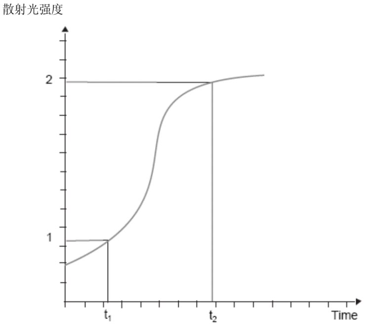 第一个检测模式为终点检测。仅用于某些选定项目,例如以TCA(三氯乙酸)沉淀法检测血清、血浆、尿液和脑脊液内的总蛋白。 该方法学检测抗原抗体反应的最大浊度。然后将检测信号值与校正曲线比较转换为蛋白浓度。 图12、散射免疫散射比浊的终点检测模式 第二个检测模式为定时速率。这个模式,是在两个时间点检测信号间差异,去确定样品内蛋白浓度。 将反应组分转入比色杯后,第一次检测(起始)在约7.5s(t1)。 第二次检测的t2,可在孵育反应6分钟、12分钟或更长时间(依据设定程序)。 计算t2和t1检测得到的散射光强度差,从校准曲线上得到蛋白浓度或其他单位值(g/L、IU/ml)。 图13、定时速率检测 这个方法的优点,是在开始时还没有形成抗原抗体复合物时,通过信号差,扣除了反应组分内因基质散射的干扰。 第三个为全程持续监视(VLinIntegral)检测模式。 VlinIntegral是一个新的数学计算处理,用来评估动力学的凝集反应,例如颗粒增强的免疫分析法或沉淀实验。 这个计算的优点是: