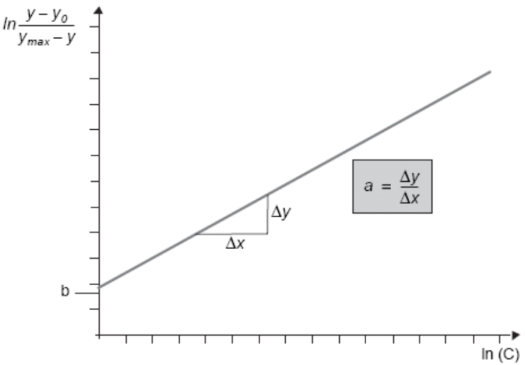 Logit-log曲线 对散射比浊结果的数学处理,很多应用了Logit-Log曲线。将标准品浓度(x)与对应散射光强度(y)各自取自然对数(In),绘制在In x和In y图上。由图上可看到随着分析物浓度的上升,检测散射光强度的变化。如图7-24。该图也称为Logit-Log函数。 图15、Logit-Log函数图 该图表示了检测散射光强度y,与各个校准品浓度C的关系。因为采用了互相取对数表示,反映了免疫反应连续的信号级数变化。 如果logit-log曲线很好,可进行以下计算: 式中:y为检测信号bit值;C为浓度值;y0为最小计算信号;ymax为最大计算信号;a为斜率;b为截距。 y0、ymax、a和b均由电脑计算出来的参数。参考曲线的趋向可由这四个参数描述。