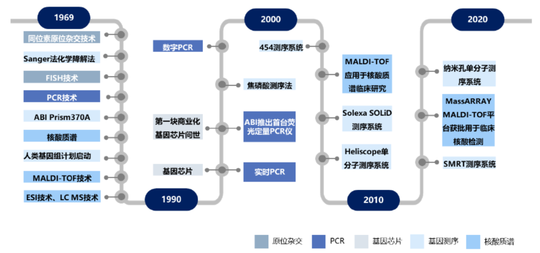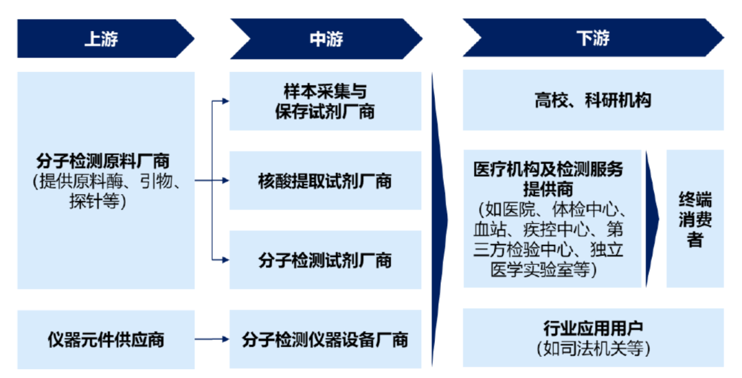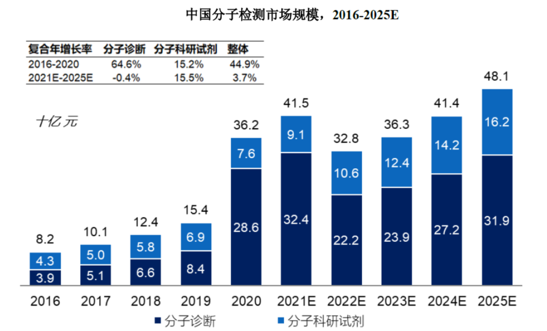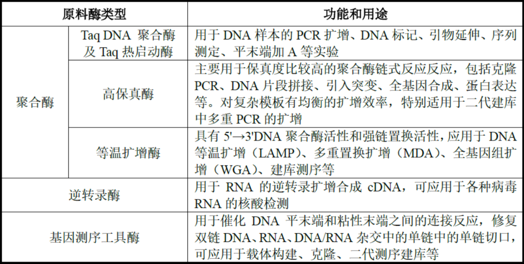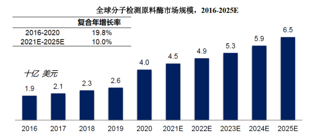 分子检测是利用分子生物学技术,对体液、血液、组织等样本中的核酸物质进行检测和分析。分子诊断是分子检测技术在体外诊断中的应用,是目前体外诊断领域发展最快、技术最前沿的方向。除疾病诊断外,科研院所、药企、CRO等也会使用分子检测技术和产品开展研发工作。分子检测根据技术平台的不同可分为聚合酶链核酸扩增技术(PCR)、基因测序、荧光原位杂交(FISH)、基因芯片和核酸质谱等,具体情况如下:1969年,科学家利用基因探针及同位素标记核酸探针进行基因定位,创造了原位杂交技术,首次利用分子检测技术进行遗传病基因诊断。自此以后,随着分子生物学技术迅速发展,基因测序技术、PCR技术、基因芯片等技术相继问世,推动了分子检测领域的进步。PCR技术是目前使用最广泛的分子检测技术。自1983年被发明以来,PCR技术已应用于生物科学研究的所有领域,包括临床、农业、法医和诊断,是生命科学研究领域中一次革命。随着现代分子生物学技术逐渐完备,PCR技术也在不断发展创新,实时荧光定量PCR(qPCR)技术于1992年问世,该技术可以实时地监控PCR进程,并对核酸含量进行定量分析,目前已成为PCR技术中的主流,也是分子检测行业最普及的技术平台。基因测序技术是最前沿的分子检测技术之一。第一代测序技术发明于1977年,但该技术只能获得一条长度在700-1000个碱基的序列,无法满足现代科学发展对生物基因序列获取的迫切需求。高通量测序是对传统测序方法的变革,一次运行即可同时得到几十万到几百万条核酸分子的序列,因此也被称为新一代测序(NGS)或二代测序。PCR技术更适合已知突变基因的定量检测,具有检测速度快、准确性高、性价比高的特点,在传染病、肿瘤诊断、遗传病等临床领域有广泛应用;基因测序技术可检测未知序列和未知突变的基因,适合高通量、多位点的基因检测,在科研、肿瘤筛查和产前筛查等领域应用较多,但检测费用相对较高。国内分子检测产业的上游为提供酶、引物、探针和底物的分子检测原料厂商和仪器元件供应商,中游为核酸样本保存试剂、核酸提取试剂、核酸检测试剂盒生产商和PCR仪、测序仪等设备生产商,下游是试剂和仪器的使用者,包括高校、科研机构、药企、CRO、医院、第三方医学实验室、血站、体检中心等。近年来,随着人口老龄化、健康意识的提高以及新兴技术的进步,分子检测市场规模稳步增长。从2016年至2020年,全球分子检测市场由94.1亿美元增长至195.8亿美元,期间年复合增长率为20.1%,全球分子诊断市场相较分子科研试剂市场增速较高,期间年复合增长率分别为23.9%和14.9%。未来五年,全球分子检测行业将持续发展,至2025年,全球分子检测市场规模将达到357.8亿美元,2021-2025年的复合增长率将达12.3%。近年来国内分子检测行业发展迅速,2016年至2020年,中国分子检测市场从82.0亿元增长至361.7亿元,复合年增长率为44.9%;未来五年,我国分级医疗系统的完善、科技创新和相关政策的支持将持续推动分子检测行业的发展,至2025年,中国分子检测市场规模将达到480.7亿元。酶和引物、探针、底物等是分子检测试剂的主要原材料,其中,酶是分子检测原料中发挥生物活性的组分,直接影响分子检测试剂包括灵敏度、稳定性、检测时间等多项性能水平,决定了分子检测结果的准确性,是分子检测试剂原材料中最核心的组分。分子检测原料酶根据不同功能可以分为聚合酶、反转录酶、二代测序酶、等温扩增酶等,在PCR、二代测序等多种分子检测技术中均发挥了重要作用。分子检测原料酶行业是分子检测行业产业链上游,广阔的分子检测试剂行业发展前景将反哺分子检测酶原料市场成长。2020年在巨大的核酸检测需求面前,市场对分子诊断试剂刚性需求亟待满足,全球分子检测原料酶市场规模从2016年的19.3亿美元增长至2020年的39.7亿美元。预计到2025年,全球分子检测原料酶市场规模将达到65.3亿美元。国内分子检测原料酶市场规模从2016年的14.0亿元增长至2020的32.1亿元,预计到2025年,国内分子检测原料酶市场规模将达到52.1亿元。国内分子检测原料酶市场不断高速增长的主要驱动力是:1)疫情后分子诊断基层渗透率提升,检测机构和人数持续增加;2)中国分子诊断市场和科研用分子检测试剂市场发展迅速,持续带动分子检测原料行业发展;3)国家政策鼓励与重视分子检测试剂关键原料自主可控,原料酶产业国产化加速。