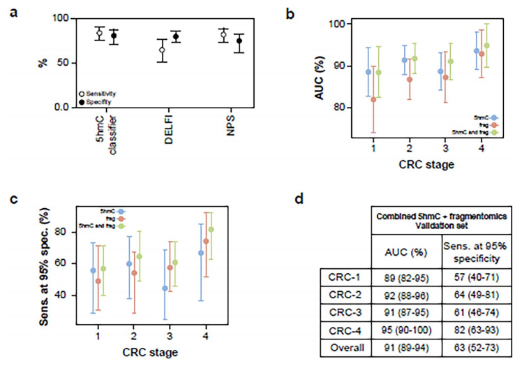 在癌症仍处于早期阶段时对其进行检测和治疗,可以挽救许多生命,降低发病率,并减轻癌症对医疗系统的负担。 液体活检是一种微创方法,用于检测体液如血液和尿液中的早期癌症。开发一种足够强大的液体活检检测方法来检测癌症有很多挑战,尤其是在早期疾病中,肿瘤仅向血液中释放微量生物标记物时。在早期疾病中,循环肿瘤DNA(ctDNA)仅占总无细胞DNA(cfDNA)的0.1–1%。从同一血液样本中测量多种生物标记物的多分析方法可能有助于检测早期癌症。 表观基因组学的变化可能先于肿瘤发生的遗传变化。因此,利用cfDNA的表观基因组进行癌症检测的兴趣越来越大。几个小组已经研究了是否可以通过cfDNA肿瘤部分的表观遗传修饰来检测癌症,因为DNA甲基化、DNA羟甲基化和cfDNA特征可能揭示染色质结构。胞嘧啶的甲基化产生甲基胞嘧啶(5mC)是一种众所周知的控制基因表达的表观遗传机制。5mC被氧化形成5-羟甲基胞嘧啶(5hmC)。5mC和5hmC具有不同的功能作用:5mC存在于异染色质和常染色质中,通常抑制基因表达,而5hmC主要存在于常染色质,与大多数高转录的基因及其增强子相关。 癌症样本中不同的功能作用和分布表明,5mC和5hmC作为生物标记物具有独立的效用。然而,寻找癌症的表观遗传标记物受到了技术限制,区分5mC和5hmC的技术有限。然而,最近出现了几种技术来量化和利用5hmC特征用于通过液体生物检测进行癌症检测。5hmC在晚期转移癌中逐渐丢失的观察结果表明,其作为生物标记物的能力可能是阶段特异性的。 近日,来自剑桥大学的研究团队在杂志Scientific reports上发表了一篇题为“Hydroxymethylation profile of cell-free DNA is a biomarker for early colorectal cancer”的文章,在这项研究中,研究团队测量了整个cfDNA中的5hmC水平,并训练了一个分类器来区分结直肠癌患者和对照组。研究团队在一个独立的验证集中评估了分类器的性能,并评估了其对癌症分期和ctDNA水平的依赖性。研究表明,cfDNA的5hmC图谱是癌症的强预测因子,包括早期癌症检测的高灵敏度。数据表明,cfDNA表观遗传变化产生的5hmC信号在早期阶段比其他分析物更敏感。当5hmC信号与cfDNA片段特征相结合以产生附加信号时,这种灵敏度保持不变。 图片来源:Scientific reports 主要内容 从cfDNA中高效捕获5hmC以产生羟甲基化组学文库 研究团队仅用5 ng cfDNA捕获了含有5hmC残基的cfDNA片段的羟甲基化组学。从2ml血浆中提取cfDNA,使用5ng cfDNA制备Illumina兼容测序文库。测序文库被变性,单链文库被复制以创建一个双链文库,其中只有一链保留表观遗传信息。5hmC残基用修饰的葡萄糖基团进行标记,然后生物素化。使用链霉亲和素珠捕获含有双链DNA片段的5hmC。从5hmC捕获的文库中回收未经表观遗传修饰的复制链,并扩增形成羟甲基化组学富集测序文库。 所有样本中均包含对照DNA序列,以报告羟甲基化组学捕获的有效性和定量。阳性对照组含有1、3或6个5hmC残基,在羟甲基化组学中富集,与输入文库相比,分别多读88、267和658倍。含有6 mC残基或未修饰胞嘧啶的阴性对照未被浓缩(分别为1倍和0.38倍)(图B)。 羟甲基化组学中富集结果。图片来源:Scientific reports 5hmC分类器高效检测包括早期阶段在内的CRC 使用增强子区域中的5hmC水平训练监督分类器算法,以区分CRC和对照组(405个CRC样本和296个对照组)。将5hmC分类器应用于验证集(220个CRC和164个对照),区分CRC和对照组的AUC为90%。AUC 4期最高(94%),在1期略微下降至89%(图A)。 5hmC分类器的特异性为84%,CRC敏感性为80%(1、2、3和4期分别为78%、83%、75%和93%)。在验证样本中,当特异性固定在95%时,以55%的灵敏度检测CRC(所有阶段合并)。 研究团队训练了5hmC分类器,成功地将肺癌(AUC 80%)、乳腺癌(AUC 82%)和前列腺癌(AUC 79%)与对照组区分开来。还训练了一个5hmC分类器,将CRC与其他癌症区分开来(AUC 78%)。且结果表明5hmC分类器对低循环肿瘤DNA(占游离细胞DNA的比例)具有鲁棒性。 5hmC分类器高效检测各期CRC。图片来源:Scientific reports 5hmC分类器在低ctDNA比例下具有鲁棒性 为了进一步研究5hmC分类器在不同癌症阶段的性能相似的发现,使用ichorCNA肿瘤比例统计估计了验证集中cfDNA样本中ctDNA的数量。据报道,ichorCNA的检测限在平均测序深度为0.1x时为3%。 使用3%阈值作为检测限,5hmC分类器正确地区分了97%的可检测肿瘤比例的CRC样本和75%的肿瘤比例低于3%检测阈值的CRC样品(图C)。这表明,当在低ctDNA比例下,5hmC分类器是鲁棒的。因此,研究团队推断5hmC分类器不仅仅依赖于ctDNA部分。 5hmC分类器在低ctDNA比例下具有鲁棒性。图片来源:Scientific reports 白细胞介素信号可能推动基于5hmC的分类 为了研究驱动5hmC分类器在低ctDNA比例CRC样本中性能的生物信号,将分类器的特征增强子映射到基因名称,并在Key Pathway Advisor软件(Clarivate)中查询。IL11信号转导到PIK3CA级联是最重要的途径。这表明来自免疫系统的cfDNA片段可能驱动检测。研究团队进一步评估了仅使用早期CRC样本(1期和2期)训练分类器时识别出的特征,并将其与仅使用晚期CRC样本训练的分类器的特征进行了比较(3期和4期)。结果发现白细胞介素信号存在于晚期CRC中。 白细胞介素信号可能推动基于5hmC的分类。图片来源:Scientific reports 与5hmC分类器相比,片段组学分类器的性能对癌症分期和ctDNA比例的依赖性更大 为了调查观察到的5hmC分类器明显缺乏分期依赖性,研究团队研究了来自相同样本(验证集)