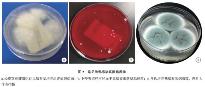 (2)分离培养:部分真菌培养困难,如毛霉目(包括根霉属、毛霉属、横梗霉属、小克银汉霉属以及根毛霉属等)。有时显微镜检可见大量菌丝,但培养阳性率不高。特别是肺穿刺组织样本,由于微生物实验室采用研磨的方法处理标本,常导至毛霉目真菌菌体被损坏,生长困难。而耶氏肺孢子菌在常见的培养肉汤、沙氏培养基、土豆培养基等均不生长。隐球菌属与曲霉属相对容易培养,但曲霉属与毛霉目真菌在周围环境中可见,也可以孢子形式被吸入呼吸道而定植,培养阳性不一定意味着感染,因此,要特别注意区分培养阳性菌株的临床价值。常见肺部感染真菌培养物详见图2。2. 免疫学诊断方法 肺部真菌感染常用的免疫学诊断试验包括1,3-β-D葡聚糖试验(G试验)、半乳甘露聚糖(GM)抗原试验、曲霉免疫球蛋白G抗体试验、隐球菌荚膜多糖抗原试验等。隐球菌荚膜多糖抗原试验在诊断隐球菌感染中具有极重要的价值,灵敏度为55%~97.7%不等,与检测时间、研究纳入人群及试剂有关。曲霉免疫球蛋白G抗体试验在超敏反应性支气管肺曲霉病与慢性肺曲霉病诊断中有较好的应用价值。G试验在肺孢子菌肺炎(PCP)诊断中,以>200 pg/ml为截断值,灵敏度与特异度可分别高达94.8%与86.3%。GM试验主要用于辅助诊断侵袭性肺曲霉病,但激素使用者较中性粒细胞缺乏者该试验更容易出现假阴性。值得注意的是,GM水平升高偶可见于镰刀菌属与荚膜组织胞浆菌感染的患者,临床上应注意甄别。