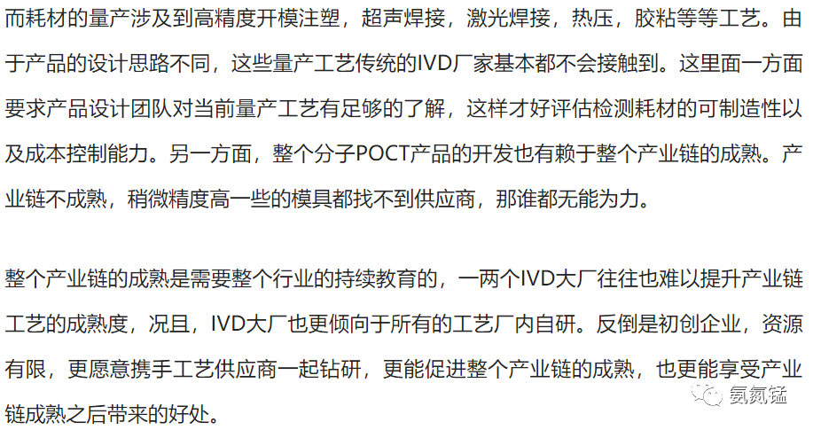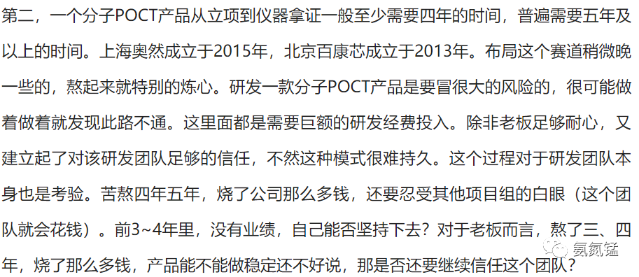 与之形成鲜明对比的是,对于一个分子POCT创业团队而言,一个靠谱的、经过充分论证过的设计方案是必需的,也是创业的前提。此外,团队会把自筹的、融资所得的每一分钱不断地投入到产品设计方案的验证和持续优化上来。在产品没有拿到证之前,整个公司的所有人都会围绕着这个产品的开发而奉献个人力量。公司因为开发这个产品而存在,整个公司也围绕这个产品的开发而配备资源。产品做稳定了,取得了注册证,公司就成功了一半,否则,公司就死路一条。有这种破釜沉舟、心无旁骛的创业心态,才能开发出革命性的、好的产品。但这离产品的市场成功还有其他一大半的路要走,初创团队可参考上海奥然和北京百康芯,虽然有了注册证分子POCT产品,和成功其实还有蛮长的路要走。