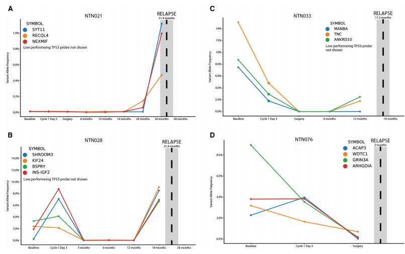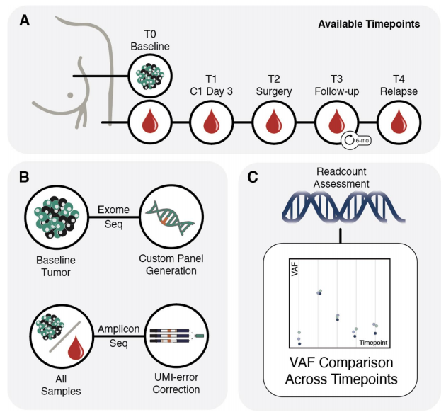 新辅助治疗广泛应用于三阴性乳腺癌(TNBC)患者。这种治疗方法允许在体内评估临床有意义的反应,从而能够快速识别用于定制辅助全身治疗的有效药物。接受新辅助全身治疗的TNBC患者中,约30%至65%的患者实现了病理完全缓解(pCR)。未达到pCR的患者往往复发率高,总体生存率低。非pCR患者的3年远处复发风险为27%,而达到pCR的患者为9%。新辅助化疗后的3年无事件生存率在无pCR患者中约为57%-68%,而在pCR患者中为92%-94%,一旦TNBC复发,中位生存期仅有18–28个月。化疗无法根除微小残留疾病被认为是由于对化疗具有内在抗性的细胞逃逸,而常规临床实践中使用现有工具无法检测到这些细胞。 在这种情况下,液体活检测量循环肿瘤DNA(ctDNA)为评估化疗的实时反应提供了一种有希望的工具。在晚期TNBC中,下一代ctDNA测序显示出与组织活检中发现的突变高度一致。ctDNA也被评估为预测乳腺癌患者预后的一种有前景的工具。 大多数早期TNBC患者ctDNA的传统测序方法都使用了针对TNBC中常见的复发突变基因的通用模板。在这些研究中,模板不包括每个个体肿瘤特有的体细胞变体。由于TNBC具有高度的患者间异质性,这样的通用分析可能会忽略患者特有的分子变化。 近日,一组来自美国的研究团队在杂志Scientific reports上发表了一篇题为“Personalized ctDNA micro-panels can monitor and predict clinical outcomes for patients with triple-negative breast cancer”的文章,在文章中,研究团队报告了一项对50名患者的研究结果,试图确定化疗前、化疗中和化疗后的纵向追踪ctDNA水平是否可以预测正在进行的前瞻性试验中治疗的TNBC患者的临床结果。 图片来源:Scientific reports 主要内容 临床数据 纵向调查ctDNA的队列共包含50名患者,平均年龄为52岁(25-74岁),32%为非裔美国人,84%临床分期为II期。7名患者(14%)出现疾病复发,5名患者(10%)在报告生成时死亡。 样本采集和测序方法概述。图片来源:Scientific reports 用于定制ctDNA微面板开发的 全外显子组测序 在基线正常和配对肿瘤样品进行全外显子组测序。在所有靶向外显子位置,正常和肿瘤样本的中位数覆盖率为79个碱基和73个碱基。所有肿瘤的体细胞变异中位数为77.5(下图)。总共鉴定出7513个变体。在86%的肿瘤中发现了TP53突变(n = 43例患者)。两个样品(NTN069和NTN056)具有较高的突变负荷(> 750个变体);两个患者都没有观察到BRCA1/BRCA2变体。在所有50名患者中选择了208个WES变体,用于开发定制ctDNA微面板。 在基线(T0)时,有8个样本具有肿瘤组织的WES和定制的外周血ctDNA微面板测序。在8个样本中的33个可检测变异中,82%(n=27个变异)在组织和外周血中都可检测到,这证明了肿瘤测序与外周血测序的准确性和一致性。基线肿瘤组织中变异的平均VAF为32.9%,而外周血中变异的VAF为0.33%。 肿瘤/匹配正常基因组DNA基线(T0)WES瀑布图。图片来源:Scientific reports ctDNA监测与临床结果 总共,针对所有50个患者样本的208个独特变体。在本研究分析的50名患者中,有7名患者在疾病监测期间报告了临床复发。其中4例在报告复发的6个月内进行了ctDNA测序(下图)。四名患者中有三名在报告临床复发之前表现出患者特异性扩增子特征的分子复发,另外一名患者在手术时表现出持续性/残留性疾病,然后在手术后2个月复发。另外有3名患者出现临床复发,但他们最近的ctDNA时间点在复发前6个月以上,排除了ctDNA微面板预测临床复发的能力。这些数据表明,如果在临床复发的6个月内进行ctDNA微组,则使用ctDNA微板在临床复发之前检测到4名患者中的4名患者的分子复发。 21名患者在监测期间未出现临床复发。其中17例使用定制ctDNA微面板显示分子缓解。有4名患者表现出潜在的分子复发,但没有临床复发。一名患者(NTN0022)在预计的临床复发时间内失去随访。其他3例患者在潜在的分子复发后至少随访22个月。鉴于每个样本的3-4个变体中只有一个在分子水平上被检测为阳性,这些样本可能是假阳性。 临床复发前表现出分子复发的患者。图片来源:Scientific reports ctDNA阳性与pCR的关系 在本研究中分析的50名患者中,25名患者可用于评估ctDNA作为复发的生物标志物。如果定制ctDNA微面板中的任何变体具有VAF > 0.005%,则确定样品具有阳性ctDNA结果. 在每个时间点对每个患者进行评估,以确定阳性率。在8名pCR患者中,只有1名患者(12.5%)在缓解期间时间点显示ctDNA阳性。相反,在17名无pCR的患者中,8名患者(47%)在缓解期至少一个时间点显示ctDNA阳性。pCR患者与非pCR患者的阳性率差异无显著性,但呈趋势性相关(p值 = 0.10; 卡方检验)(下图)。 分子复发(肿瘤特异性VAF检测)与病理完全反应(pCR)之间的关系。图片来源:Scientific reports 总结与讨论 这项观察性研究表明,应用于ctDNA的4-6个患者特异性变体的定制微面板可用于预测和监测早期TNBC患者的疾病复发。这个定制面板中的每一个变体都是个体独有的,从而可以在临床复发之前精确地识别分子复发。ctDNA中患者特异性变异的检测也显示出与pCR失败的趋势相关性,提示TNBC患者的潜在预后效用。 定制ctDNA微面板的使用提供了相对于传统通用面板的可能改进,传统通用面板具有针对所有正在评估的肿瘤的设定数量的基因/位点。通用面板的使用可能不包括在监测期间提供足够灵敏度检测分子复发的有用变体,这些变体可能提供临床相关信息,如分子复发和与pCR的关联。 为每个个体的肿瘤识别的自定义变体不需