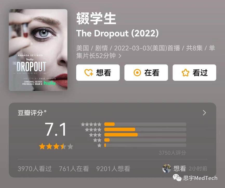 2022年3月3日,该事件的电视剧《The Dropout(辍学生)》已于在美国播出,共8集。剧集改编自ABC News/ABC Radio的同名播客,讲述霍姆斯如何崛起及坠落。其中,深受美国人喜爱的女星Amanda Seyfried饰演霍姆斯