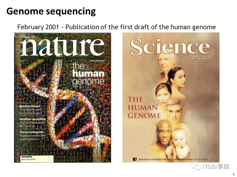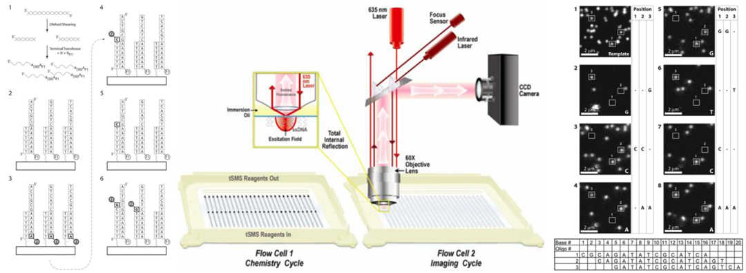 1959年的冬天,物理学家Richard Feynman在加州理工举办的美国物理年会上作了题为"There's Plenty of Room at the Bottom: An Invitation to Enter a New Field of Physics"的演讲,在这个轰动世界的演讲中,他向人们描述了一个奇幻的世界。在这个世界中,大英百科全书被记录在大头针的针头上;人们可以通过电子显微镜看到一个原子和DNA上突变的碱基;大量的信息可以存储在很小的空间里,字母可以用六或七位的字符表示..。这些预言在当代已经实现,他当时甚至还提出了要将计算机和晶体管等电子器件做的更小,还阐述了像光刻和蒸镀这种现代芯片的工艺技术的思路。 巧合的是,演讲的同一年,Mohamed Atalla和Dawon Kahng在远在东海岸的贝尔实验室中发明了金属氧化物半导体场效应晶体管(MOSFET),这是真正意义上的第一个可以微型化且批量生产的晶体管。从那年开始,晶体管被做的更小,更多的晶体管被集成在一个电路上。 1965年的春天,也就是Feynman演讲的6年之后,Fairchild Semiconductor和Intel的创始人,同在加州的Gordon Moore,提出了一个惊人的观点,他认为集成电路中晶体管的密度每年都会翻倍,晶体管的体积每年缩小一倍,并且这种速度会持续至少十年,十年后他将这个速度修正为每18-24个月,他修正后的观点神奇地预测了历史,即为著名的摩尔定律。在摩尔定律自我预言实现的驱使下,集成电路微处理器的性能不断翻倍,且伴随着价格的快速下降,晶体管的尺寸下降到了微米甚至纳米级。1988年秋天,一个名为“分子电子器件”的特殊会议召开了,在这一年的早些时候,Aviram详细的描述了一个理论上摩尔定律下晶体管微型化的最终目标 – 单分子晶体管,因为单个分子构成了可想象中的最小的稳定结构,在这个会议上,科学家们提出了各种各样的单分子所构成的电子器件的设想,讨论着摩尔定律未来的终局。可以说,摩尔定律指导了人类在半导体行业的长期规划和研发目标的设定,在我们的生物科技领域,摩尔定律也同样指导了一个无比重要的研究方向 – 下一代测序技术(next-generation sequencing),也就是我们常说的NGS或二代测序技术。 同曼哈顿原子弹计划和阿波罗计划并称为三大科学计划的人类基因组计划(Human Genome Project)于1990年在全世界范围内展开了,它被誉为生命科学的“登月计划”,历时十三年耗资30亿美金,测序工作的完成解开了人体内2.5万个基因的30亿个碱基对的秘密,但当我们把图谱和花费联系到一起时,发现平均检测1个碱基需要1美元,这个成本成为了个体化常规化基因组测序不可逾越的鸿沟。 在人类基因组计划接近尾声的时候,科学家们开始讨论如何将基因组测序的时间缩短,成本降低。2002年波士顿的GSAC会议(The Genome Sequencing and Analysis Conference)的开幕演讲中,包括George M. Church等基因测序的先驱们发表了名为“The Future of Sequencing: Advancing Towards the $1000 Genome.”的演讲,这一演讲明确了人类向1000美元测序时代冲刺的决心,两年后美国人类基因组研究所(National Human Genome Research Institute)提出了推动突破性测序技术发展的特殊计划,我们很有幸也参与其中。 当时参与这个计划的几个团队都不约而同的想到了同一个方向 – 单分子测序,同单分子晶体管一样,对单个核酸分子测序是可想象的最小成本、最短时间的测序方案,以往的测序方案都需要做PCR扩增,且重复地测同一个序列,在当时的实验能力与原材料产能不足的情况下,测序的成本很难被降低。在单分子测序的方向中,产生了几个著名的商业化公司,也都采用了不同的很有趣的测序方法。 Helicos的创始人之一Stephen Quake,是瀚海基因创始人贺建奎博士做博士后时的导师,公司的Helicos Genetic Analysis Platform是第一个通过对单个DNA分子成像来实现基因测序技术的仪器。Helicos也是采用边合成边测序(Sequencing by Synthesis)的方法,预先将多个单分子单链DNA固定在基底上,每次只添加一种有荧光标记的单核苷酸,通过聚合酶进行合成,在反应后直接显微成像,有荧光标记的分子被记录为完成了一个碱基的配对,不断地重复AGCT四种核苷酸的配对合成直到完成整条单链DNA的配对,如右侧图下面的表格所示,对记录的三条单链DNA分子不断重复后直接读出了连续的15个碱基序列。 在Helicos的设备中,一个关键技术是中间图所示的全内反射荧光(total internal reflection fluorescence)成像,因为麦克斯韦方程组对光(电磁波)的描述为连续方程,当光在两个不同折射率所形成的界面之间反射的时候,会沿着界面产生一个光的渐逝场,场强随着离开界面的距离指数递减,非常灵敏,且场的作用距离只有光波长的几分之一,将背景中的噪音降到最低,在当时Helicos商业化的设备中以这种结束通过物镜对样本的扫描可以在很大面积的基底上进行高灵敏度的单分子荧光成像,从而完成单分子测序。 2003年1月的Science杂志发表了一篇名为“Zero-Mode Waveguides for Single-Molecule Analysis at High Concentrations”的封面文章,文章中描述了一种可高平行同时检测单分子的动态过程的方法,这个装置实现方法非常简单,即在熔融石英表面上的金属铝镀膜中做出数十纳米的微孔的阵列,由于孔的直径小于入射光的波长,入射光主要的能量被限制在微孔的底部,无法传播出去,因此被称为零模波导,这种芯片器件能以微秒的时间分辨率研究微摩尔浓度下的单分子动力学。 Pacific Biosciences的创始人Stephen W. Turner等科学家研究了6年之后,