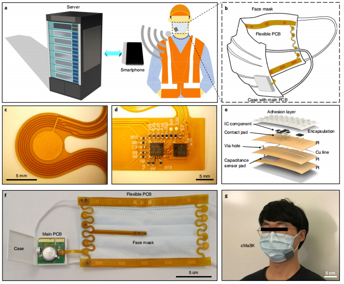 近日,来自美国的一个研究团队在杂志Nature electronics杂志上发表了一篇题为“A conformable sensory face mask for decoding biological and environmental signals”的文章。在这篇文章中,研究团队报道了一种可与商用面罩集成的适形多模态感官面罩(conformable multimodal sensory face mask, cMaSK),用于监测与传染病、环境条件和面罩佩戴状态相关的信号。设计包括实现低功耗操作的组件和固件,具有蓝牙低能耗的微处理器,以及与面罩集成的印制电路板(PCB)。薄粘合层允许集成系统与各种商用面罩(如外科口罩、N95口罩和棉口罩)反复粘合和分层。还开发了一个移动应用程序,通过蓝牙无线连接到cMaSK,并将数据传输到服务器进行数据存储和分析。