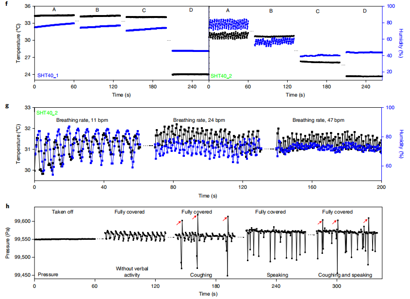 当cMaSK未正确佩戴时,呼吸引起的波动变得更弱,甚至消失(下图)。传感器表征结果验证了cMaSK可以基于这些多模态信号对面罩的佩戴位置进行分类。此外,通过计算温度、湿度和气压的波动次数,可以高精度地识别呼吸频率,甚至可以在说话时检测咳嗽。因此,研究团队验证了cMaSK可以监测与传染病相关的关键生物信号,如呼吸频率、咳嗽和皮肤温度。