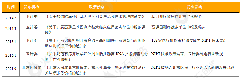 前言 随着三胎政策的推出,高龄产妇比例的增加,未来新生儿的数量将持续攀升,这对出生缺陷防控提出了新的挑战。目前基因检测技术已应用于孕前、产前和出生后各阶段,形成了以无创产前检测(No-Invasive-Prenatal-Testing,NIPT)为代表的相关产品和服务。随着检测技术的成熟,成本降低,监管环境的严格以及龙头企业的先发优势,NIPT行业红海格局已定。本文认为,提高市场渗透率,加快技术突破是未来扩大NIPT市场规模的主要途径。 无创产前检测(No-Invasive-Prenatal-Testing,NIPT)是一种利用高通量测序技术对母体血液中游离的胎儿DNA片段(cffDNA)进行测序,并解读胎儿遗传信息以进行相关疾病筛查的产前检测手段。通常用于鉴定胎儿是否存在21(唐氏综合征)、18(爱德华氏综合征)和13(帕陶氏综合征)三体异常。相较于传统检测技术如穿刺、超声、血清学唐氏筛查等,NIPT具有无创、检出率高、流产风险低等诸多优势,不仅扩大了检测时间窗口,安全性、特异性、敏感性也得到了大幅度提升。 来源:火石创造根据公开资料 1 无创产前检测发展现状 作为中国高通量测序(Next-generation sequencing technology,NGS)临床应用的第一站,NIPT的诞生和发展离不开NGS技术的不断成熟。NGS技术又称二代测序技术,可实现边合成边测序,适合大规模DNA样本。 自2005年以来NGS技术发展迅速,凭借高通量、低成本、测序时间短等优势成为了市场商用主流测序手段。目前NGS技术已应用于多个领域包括传染病诊断、孕产前检查及遗传病检测、肿瘤早筛和伴随诊断等。随着技术的持续更新和迭代,测序成本不断下降,远超摩尔定律速度。预计2022年成本将降低至300美金/每人,2024年有望实现100美金/每人全基因组目标。加上NIPT产品具有特殊性,涉及伦理、隐私和人类遗传资源保护、价格、质量等问题,整体监管环境跨越了自由发展、监管严格、试点准入、分业监管等阶段。 2014年2月,国家食品药品监管总局(CFDA)和国家卫生计生委联合发布《关于加强临床使用基因测序相关产品和技术管理的通知》叫停基因测序相关产品的临床应用,行业暂时进入了停滞期。而同年7月CFDA批准了BGISEQ-1000基因测序仪、BGISEQ-100基因测序仪和胎儿染色体非整倍体(T21、T18、T13)检测试剂盒(联合探针锚定连接测序法)、胎儿染色体非整倍体(T21、T18、T13)检测试剂盒(半导体测序法)的医疗器械注册,NIPT正式成为二代基因测序产品的新领地。 随着CFDA批准华大基因、贝瑞基因、达安基因、博奥生物等多家公司的NIPT产品,积极开展临床试点,行业监管逐步规范化。目前部分省份已经发文明确NIPT检测价格并积极将其纳入医保报销范畴,价格约在800-2400元之间,NIPT已进入大众价时代。 来源:美国国家卫生院 来源:国家卫生计生委、国家食品药品监管总局 来源:火石创造根据公开资料整理 NIPT产业链上游涉及测序设备和相关配套试剂,壁垒极高。尤其是测序设备,国内目前只有华大智造一家具备独立自主研发并实现量产的能力,其他企业主要通过贴牌或与国际巨头如Illumina合作开发。另外药监局要求NIPT产品上市后仍需提交至少10家临床机构、总数不少于10万例临床使用数据作为临床补充资料在产品下一次延续注册时提交。 截至2019年底,华大基因和贝瑞基因NIPT累计检测样本量分别达到600万例和350+万例,领先于其他厂商。同时贝瑞基因也成为了国内首例通过NMPA延续注册申请的厂家。设备的垄断加上临床数据的限制使得我国NIPT市场呈现寡头竞争。目前提供NIPT检测服务的企业主要有华大基因、贝瑞基因、博奥生物、安诺优达、达安基因等9家。其中华大基因和贝瑞基因凭借先发优势、丰富的临床数据积累以及自身技术和平台优势占据了绝大部分市场份额,市占率合计约为68%。这对有意布局该领域的企业而言进入难度较大,行业两强竞争格局已形成。 来源:火石创造根据公开资料整理 2 无创产前检测发展趋势 随着测序成本的降低,国内监管环境趋严,竞争格局逐渐稳定,我国NIPT市场已走向成熟。加之我国每年新生儿数量的持续下跌,市场增量空间较小。预计未来NIPT市场规模增长不明显,但渗透率仍有较大提升空间。根据智研智库和观研天下调查结果显示,2015年我国NIPT渗透率只有4.75%,2021年则上升至约50%,据国元证券测算2025年高龄产妇NIPT渗透率有望达到90%,非高龄产妇NIPT渗透率达至50%。因此市场未来的发力点在于存量的渗透率提升和增量的技术突破。 来源:火石创造根据公开资料整理 在渗透率方面,增加检测需求,扩大应用领域是主要驱动因素。我国已逐步放开二胎政策,鼓励三胎政策,这直接引起高龄产妇占比上升,预计2025年我国高龄产妇占比将达到26%,高龄产妇NIPT市场规模将扩大至38.61亿元。另外随着大众健康意识和风险意识的增强,非高龄孕妇NIPT渗透率进一步增加,预计2025年我国非高龄产妇市场规模将达到61.05亿元。因此未来NIPT应用领域呈现由高风险人群向普筛发展的趋势,非高龄产妇群体将成为NIPT市场增长的主要着力点。同时自2013年深圳率先将NIPT检测纳入医保后,2021年9月NIPT检测也正式纳入北京医保,医保支付政策的进一步鼓励和支持使得NIPT的医保覆盖将深入更多地区,未来三四五线城市将成为各家竞争的焦点。 在技术突破上,部分企业积极布局上游测序设备的开发,有望打破上游市场的垄断局面。博奥生物、安诺优达和达安基因生产的测