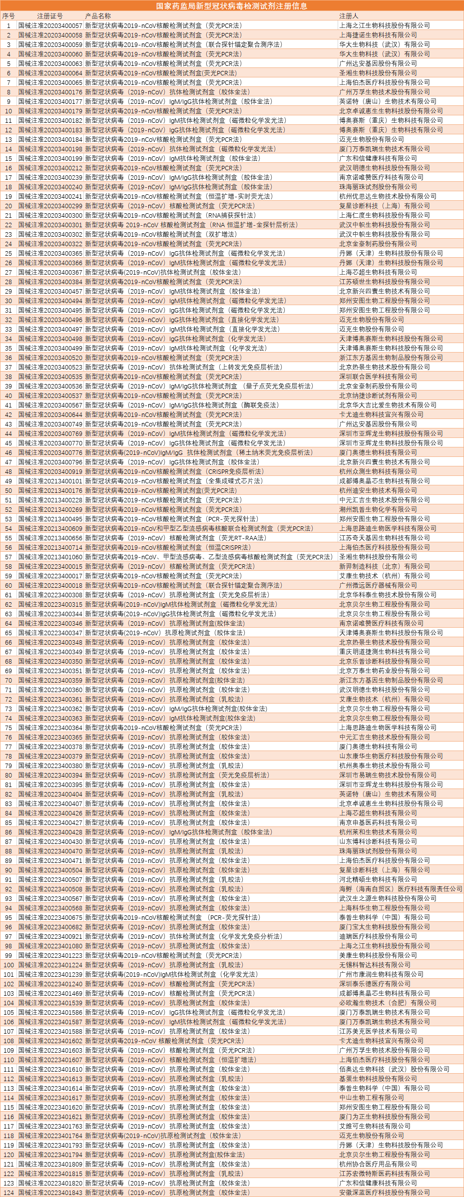 截至2023年2月,NMPA已完成124个新型冠状病毒检测试剂盒的应急审评工作,上述产品经国家药监局审批获准上市。