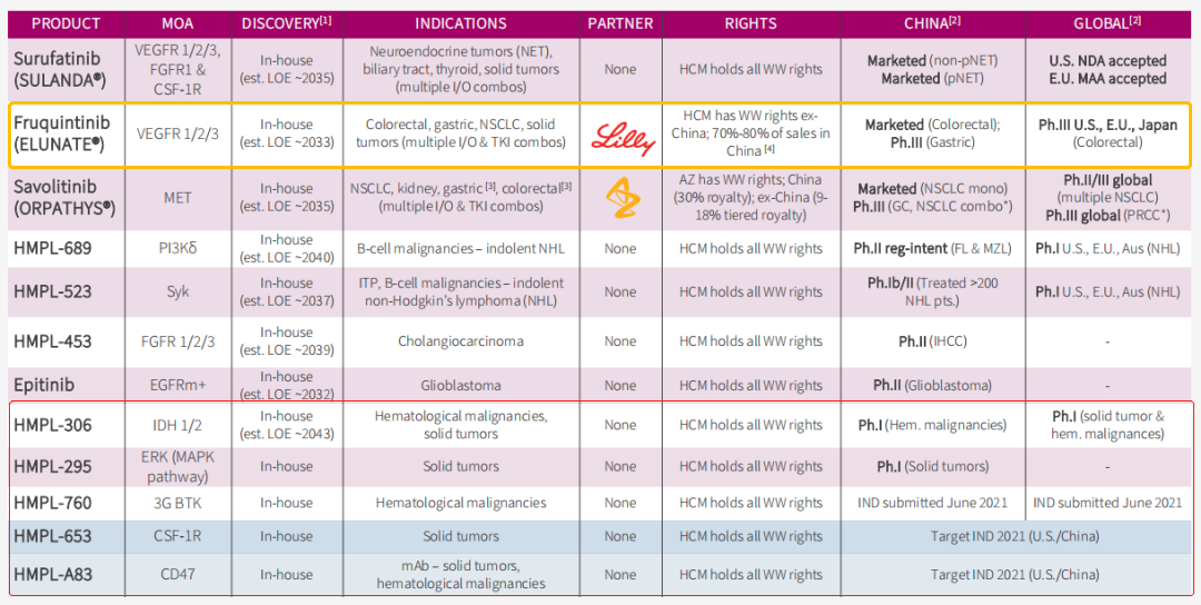 和黄医药目前已有3款自研创新药上市销售(其中2款已纳入医保),此外,- 临床试验阶段药物:11款在中国进行,其中6款同时在美国和欧洲进行临床试验。