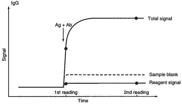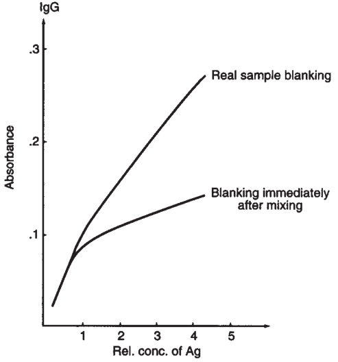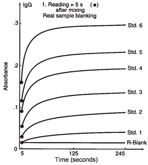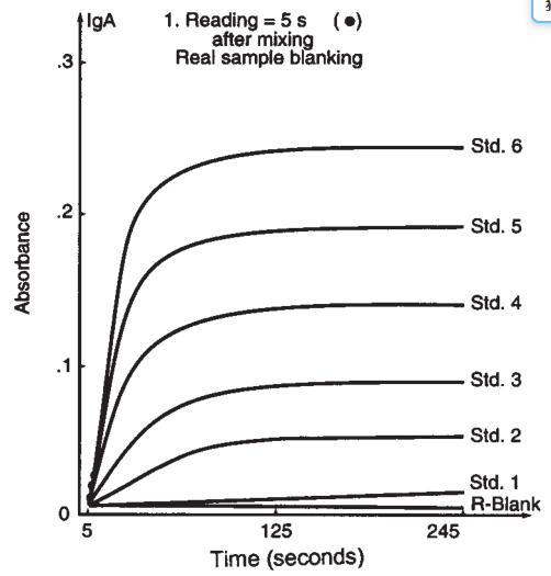 蛋白质标准化 免疫散射比浊和/或免疫透射比浊检测方法的最佳化 冯仁丰 读数原理 现代自动仪器按照关于试剂的混匀和信号的阅读的三个不同原理之一操作。其中两个原理展现在以下离心分析仪上,于340nm得到免疫透射比浊的结果。 a)真实样品空白 理想方式得到最适信号展现在图6和图7. 首先,加入反应缓冲液到反应比色杯。然后,加入样品,与缓冲液混合,在预温阶段最后,读取第一个读数。这是真实的样品空白(图6和图7中标记为“1st reading”),被储存在仪器记忆中。 图6、作为时间函数形成的信号。使用人IgG作为“真实样品空白”示例。 图7、作为时间函数形成的信号。使用人IgG作为“真实样品空白”示例。 下一步,加入专一的抗体,与被预温样品混合。因抗原与抗体间的反应,在很短的时间里形成了浊度。 在信号变得接近恒定,说明反应已经接近终点 — 通常在4-6分钟后 — 读取第二个读数(在图6和图7中标记为“2nd reading”),储存在仪器的记忆中。这个读数是代表样品空白、试剂空白、和抗原-抗体反应的信号之和。 在相同时间间隔,试剂空白在单独的比色杯中以相同的时间间隔平行检测。终点信号代表了,在反应缓冲液和空白样品(如水或盐水)和抗体本身混合引起的浊度。这个值,仅在一个比色杯中获取,被用于纠正来自样品比色杯所有信号。理想地,试剂空白值应非常低。 用于计算的信号可参见表1。 样品比色杯和试剂比色杯的值之差,从第二个读数中减去各个第一个读数(最后一栏)。 在减去试剂空白读数后得到了最后信号。在抗体过剩区带得到了提供的样品读数,最后结果随样品中抗原浓度升高而升高。 在抗体加入前即刻阅读的读数的原理,经常被提及为:真实样品空白或使用样品预温的两个试剂原理。 这个原理展现在图6和图7的两个不同血清蛋白质,IgA和IgG。 b)混合所有试剂后即刻的空白读数 一些自动仪器按照另一个原理操作,混合试剂和阅读信号,如图8和图9所示。 图8、作为时间函数形成的信号。“混合所有试剂后即刻的空白读数”,使用人血清IgA为示例。Ag:抗原,Ab:抗体。 图9、作为时间函数形成的信号。“混合所有试剂后即刻的空白读数”,使用人血清IgG为示例。Ag:抗原,Ab:抗体。 开始,反应缓冲液、样品、和抗体混合。然后,尽快,通常混合后的5-10秒,取第一个读数,并储存在仪器的记忆中,作为空白值。 4-6分钟后,反应已经达到它的终点,取第二个读数,并储存在仪器记忆中。该信号用于如表2所示的计算中。 最后得到的结果简单地从第二个读数中减去第一个读数。 这个原理的优点是,当然,它节约了时间,因为没有了预温,它有些简单。由于没有要求检测试剂空白,经常被作为简单的试剂系统。 但是,这个原理有很严重的缺点。 首先,5-10秒对所有样品稳定和达到一个恒定的信号不总是足够的。这会要求到2分钟。所以,第一个读数会不包括总的样品空白,但仅仅是一部分。 第二,免疫反应已经开始,早期的反应信号被丢失。作为一个“缓慢”的反应系统,如IgA,在与抗体混合后的第一个读数在5秒钟,不是非常严格的(图8)。 但是,作为“快速”反应系统,如IgG,已经反应了一半才取第一个读数(图9)。事实上,许多蛋白质与相应抗体的反应非常快,延误5秒钟变得很关键。在抗原和抗体间的反应是这个时间运行处于最大的速度,所以,很难确定得到第一个读数的点。 “混匀所有试剂后的即刻空白”的实际含义,可容易地通过比较由IgA和IgG的6个标准的信号形成曲线上予以展现(分别为图10和图11)。 图10、以人IgA为例,6个标准以时间为函数的信号发展。Std,标准;R,试剂。 图11、以人IgG为例,6个标准以时间为函数的信号发展。Std,标准;R,试剂。 对于缓慢反应的IgA系统,5-秒钟的延缓不显著。 对于快速反应的IgG系统,在第一个5秒钟期间,有相当多的信号发展。这使得(第一个读数的)秒时间和第一个吸光度读数间有显著差异,看来丢失的信号随标准中IgG浓度增加而增加。 IgA的标准曲线实际上没有被两个空白方式间的差异所影响(图12),但在IgG的标准曲线绘制中有着很大的影响(图13)。这里丢失的信号对较高标准越来越明显,造成要低得多的“较低”的标准曲线。 在图14中,为离心分析仪上第一次读数的时间对标准曲线数据的影响。在离心分析仪达到了它最后速度后的0.5秒时,取第一个读数。由于这个仪器要求4.5秒钟达到完全的速度,图中括号内是抗原和抗体混合后过去的实际时间。 图15为两个不同的空白原理得到的、在IgG标准曲线上的插入。“较低”和“平坦”的曲线,是“混合所有试剂后即刻的空白”得到的,造成分析不精密度有明显增加,因为读数是在反应曲线的陡峭部分进行的,此处在动态和读数时间下的很小变异,会影响检测的不精密度。由于反应是在最大速度下运行的,特别重要的是,所有样品和标准必须确实是在相同时间下读数! 图12、以“真实样品空白”和“所有试剂混合后的即刻空白”得到的IgA标准曲线。 图13、以“真实样品空白”和“所有试剂混合后的即刻空白”得到的IgG标准曲线。 图14、IgG标准曲线。第一次读数时间标准曲线上的插入。 图15、IgG标准曲线。以“真实样品空白”和“混合所有试剂后即刻空白”得到的两个标准曲线上插入的影响。 而且,很重要的要强调,如果病人样品中实际蛋白质的反应速度,与校准品中该蛋白质的不一