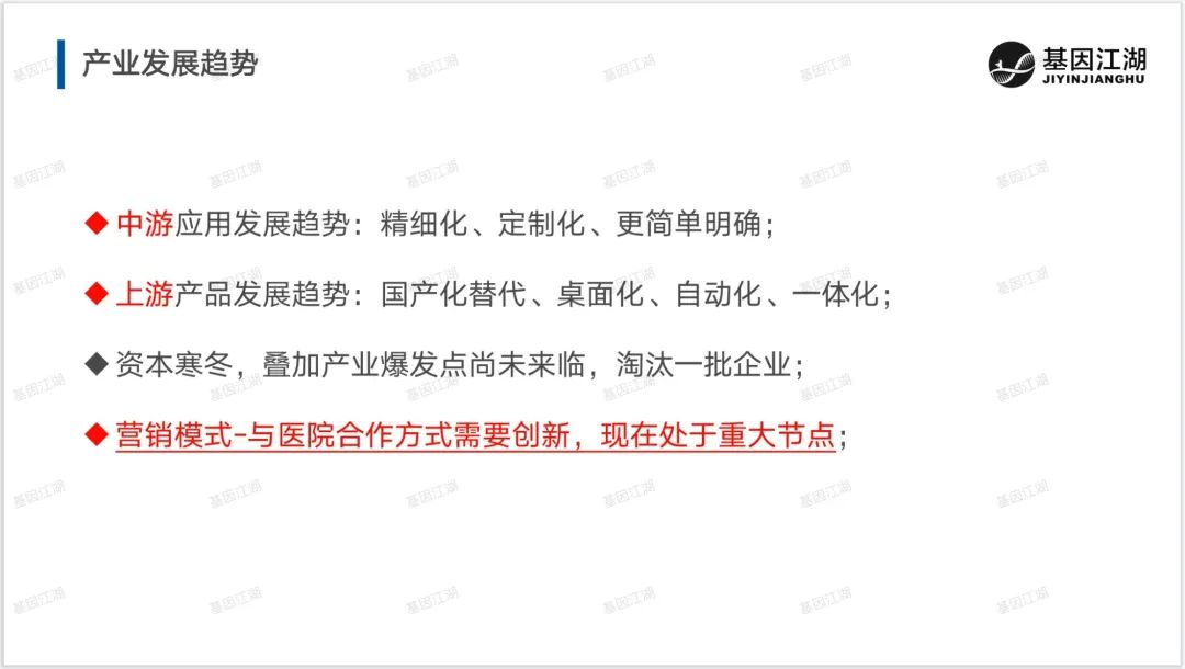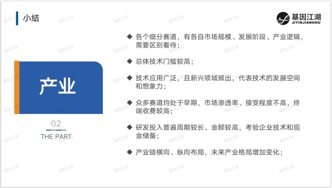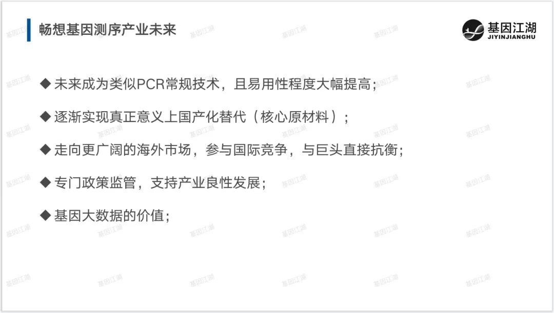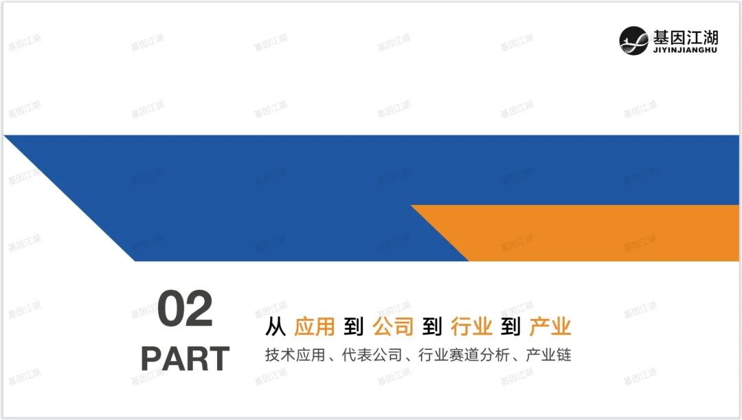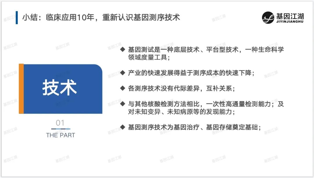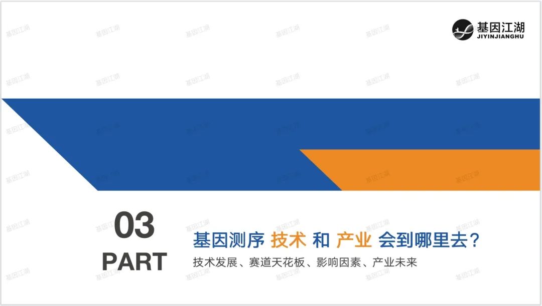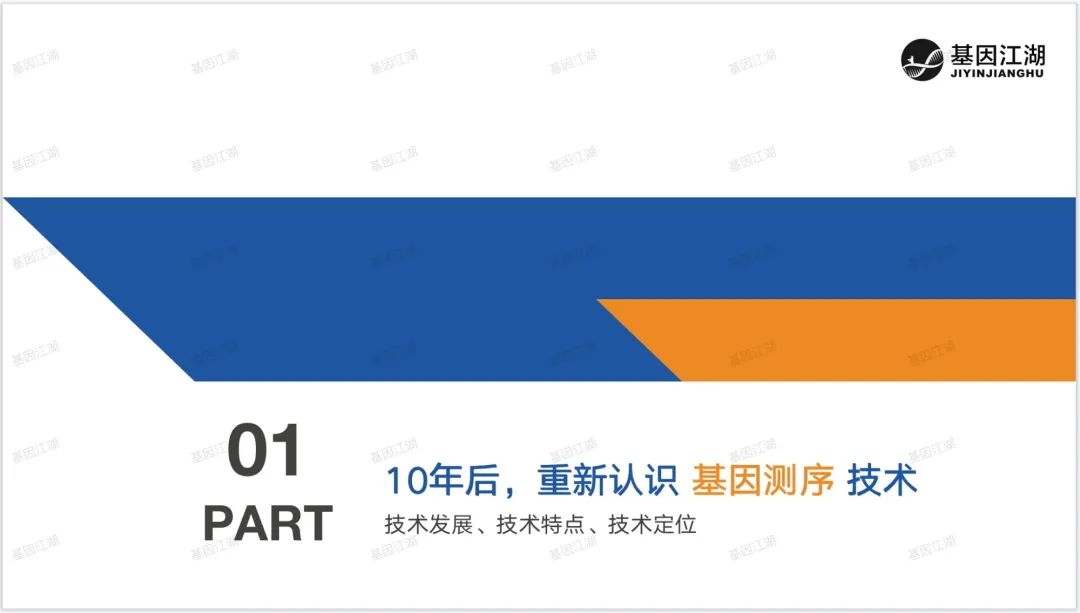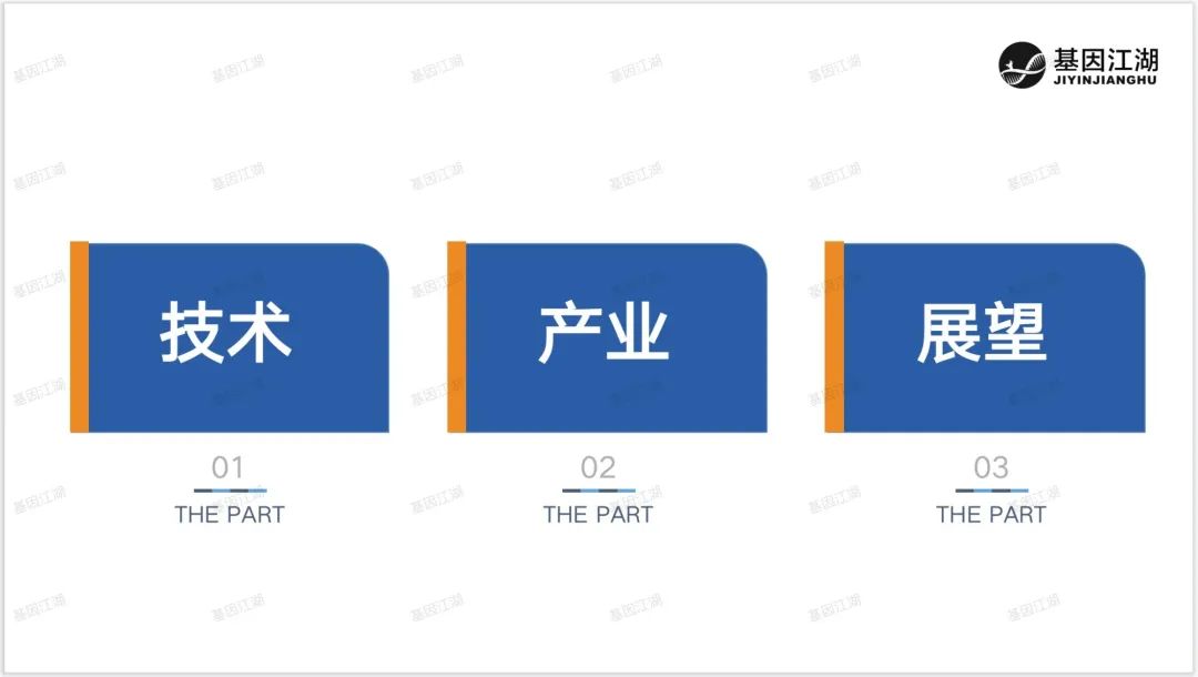 本PPT取自11月份笔者在德邦证券线下分享的PPT,听众主要是二级市场投资人。该群体一般并非医药背景,会同时看众多行业、多支股票,重点关注中短期赛道发展、公司前景,以辅助投资决策。 本PPT分为三个部分: 第一部分:技术。 聚焦测序技术,让受众对测序技术有一个客观认识; 第二部分:产业。 依次以产业、行业、赛道、公司(从大及小);以行业内上市公司分析(听众较为关注和熟悉)为切入口,探讨各个赛道的现状、风险、潜力、未来发展的突破口; 第三部分:展望。 依次为技术发展趋势、行业发展趋势、政策监管趋势,及畅想基因测序的未来形态。 核心观点已在PPT中进行描述。 提醒基因江湖的朋友们注意,本文只代表个人观点,一家之言,个人所见皆有局限,请批判性阅读、独立思考,更不构成任何投资建议。如有不同观点,也恳请加笔者微信讨论。 *NGS测序临床应用10年后,我们怎么重新看待这个技术?可以点击以前的文章:📎 沉思录 |