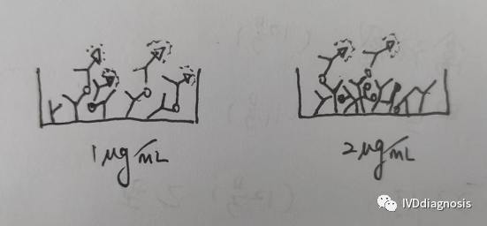 | 在试剂研发过程中,可能遇到一些反常问题,举个例子,比如对于酶免试剂,我们包被1ug/ml和2ug/ml,反应曲线如下:  在某一段区间内,1ug/ml的反应强度是要高于2ug/ml的,这是为什么呢?我怀疑最有可能的原因和空间位阻有关系。 低浓度包被在反应前期给了包被抗体和酶标抗体足够的反应空间,高浓度的包被带来的位阻反而不利于前期的反应,只是带来了后期足够的反应容量。其实,这一点同样适用于免疫层析平台。很多时候我们发现1mg/ml的包被浓度在某一段区间内,反应强度要高于2mg/ml的包被浓度,有的时候表现为灵敏度的提升,有的时候则在整个反应区间都是如此。有些人解释说抗体包被浓度高的话,部分结合不牢固,反应过程中被样本冲走了。其实我觉得,2mg/ml的包被浓度根本不算高,NC膜的蛋白结合量远不止于此,可能不同蛋白与NC膜的结合性能不同,但我只能说,这不是主要原因。并且,对于免疫层析,不知道大家有没有发现,有时候降低标记浓度,同样可以一定程度地提升灵敏度。这又是为什么呢?