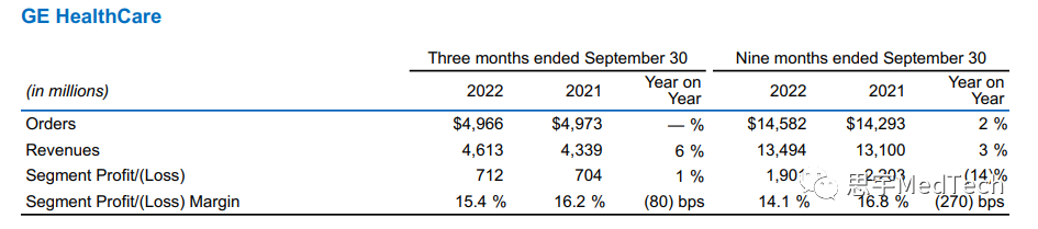 全球设备达到400万装机,每年20亿次患者扫查,GE预计,供应链挑战最多持续到2022上半年,对于业务长期可持续增长有信心。 ▲GE医疗2021年业务营收数据 GE集团第三季度总营收191亿美元,其中GE医疗2022年第三季度销售额为46.13亿美元,同比增长6.3%;净利润为7.12亿美元,同比增长1.1%。GE医疗的订单量与去年同期持平,其中来自医疗服务的订单同比增长了11%。 成像和超声设备订单的增加推动了第三季度GE医疗的收入增长。同期,设备销售增长8%,至23.5亿美元,服务收入增长5%,至22.6亿美元。 ▲ GE医疗2022年Q3业务营收数据 关于GE医疗 GE医疗致力于成为全球领先的医疗技术、药物诊断和数字化解决方案的创新者,通过提供整合解决方案、服务、数据分析,使医院运营更加高效、临床医生诊断更加有效、治疗方法更加精准、患者更加健康和幸福。在为患者和医疗机构提供服务的100多年中,GE医疗一直在推进个性化、互联互通和更富同理心的医疗关爱,同时简化患者诊疗全流程。GE医疗的医学影像、超声、生命关爱和药物诊断业务有助于提升覆盖预防、筛查、诊断、治疗和监护各环节的患者医疗关爱。 公司年营收达180亿美元,全球51,000名员工同心共创**的医疗关爱。 |