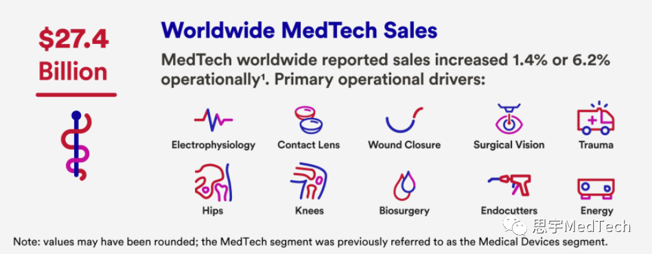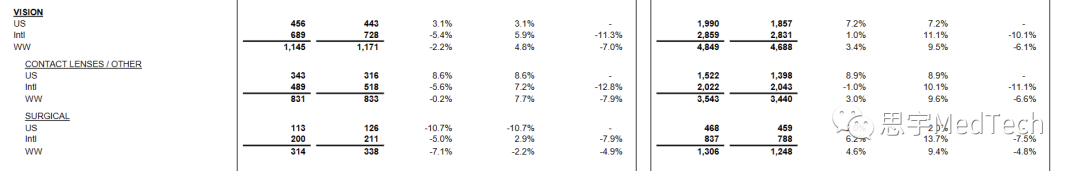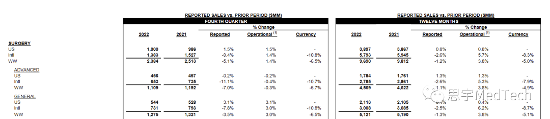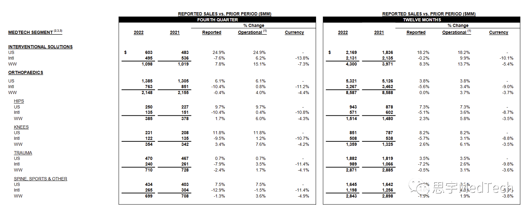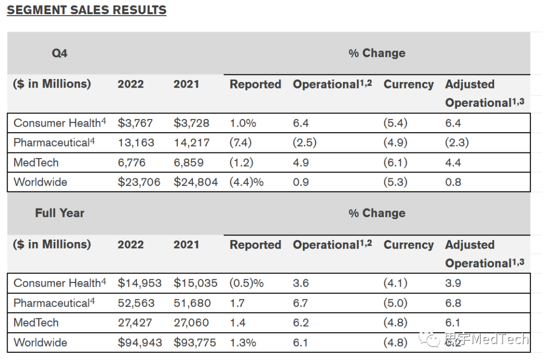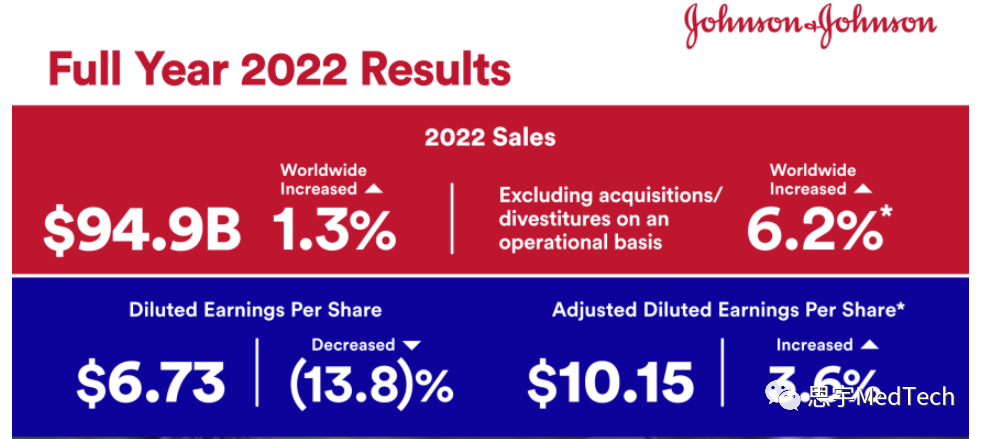 2023年1月24日,强生公司(纽约证券交易所代码:JNJ)公布了 2022 年第四季度和全年收益报告。 强生医疗器械2022年全年营收274.27亿美元,同比增长1.4%。其中外科手术、骨科、介入、眼科四类,分别占器械总收入的比例为35.33%、31.3%、15.68%、17.83%。 眼科和介入相对去年有所增长,脊椎、创伤、外科手术下滑。 在JPM23上,强生CEO Joaquin Duato在谈医疗器械业务时提到, 骨科,将把业务转移到增长更快的细分领域; 外科,将重点发展机器人和数字化外科; 眼科,将重点针对类似老花眼的领域。 并且对MedTech的增长有很强的信心。原话:the headline for me is that the MedTech market has significant potential and the MedTech market will continue to grow into the future. 2022年全年,强生总营收949.4亿美元,同比增加1.3%;(不计算新冠疫苗营收,2022全年营收927.64亿美元,同比上涨1.5%);净利润179.4亿美元,同比下降14%;全年每股收益为6.73美元,同比-13.8%。研发投入38.4亿美元,同比-18.6%,占总营收的16.2%。 (2022强生集团各业务营收数据) 丛业务范围来看,强生集团旗下共有三大业务板块收入分别为: 消费者健康业务:2022年全年营收149.53亿美元,同比下降0.5%。 (这是强生最后一次将消费者业务纳入其财报中,2022年9月,强生正式将旗下消费者健康产品部门分拆成为独立公司上市,新公司命名为Kenvue。2023年1月4日,强生宣布Kenvue将登录纽交所,并申请首次公开募股(股票代码为“KVUE”)。) 制药业务:2022年全年营收525.63亿美元,同比增长1.7%。 医疗技术业务(MedTech,也就是医疗器械部分): 2022年Q4营收67.76亿美元,同比下降1.2%。 2022年全年营收274.27亿美元,同比增长1.4%;占总收入比例28.9%。 (强生集团各大业务板块营收数据) 在医疗器械领域,强生的业务主要分外科手术、骨科、介入、眼科四类,分别占器械总收入的比例为35.33%、31.3%、15.68%、17.83%。收入情况如下: 外科手术领域,收入共计96.9亿美元,包括先进疗法(Advanced)45.69亿美元, 常规疗法(General)51.21亿美元。外科在器械总收入中占比35.33%。 骨科领域,收入共计85.87亿美元,包括髋关节15.14亿美元,膝关节13.59亿美元,创伤28.71亿美元,脊椎/运动及其他28.43亿美元。骨科在器械总收入中占比31.3% 介入领域,收入共计43亿美元,在器械总收入中占比15.68% 眼科领域,收入共计48.49亿美元,包括眼科手术13.06亿、隐形眼镜及其他35.43亿元。眼科在器械总收入中占比17.83%。 |
