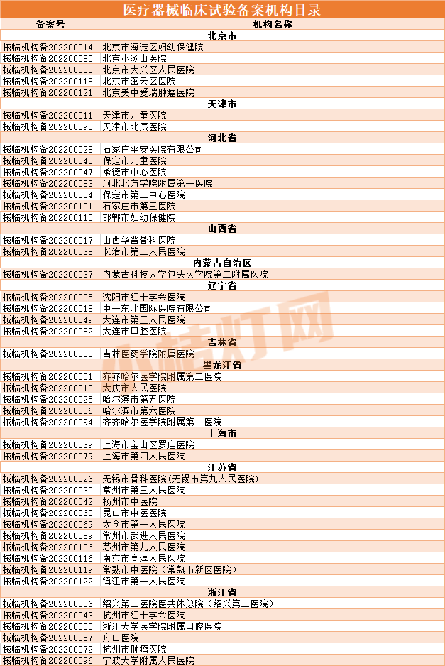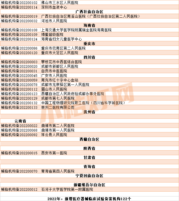 2017年11月发布的《医疗器械临床试验机构条件和备案管理办法》(2017年第145号公告),明确对符合医疗器械临床试验质量管理规范要求、具备开展医疗器械临床试验相应能力水平的医疗器械临床试验机构施行备案管理。临床试验机构应当具备的条件。包括具有二级甲等以上机构资质、设置专门的临床试验管理部门、人员、管理体系等相关要求;由药品监督管理部门建立医疗器械临床试验机构备案信息系统,用于临床试验机构登记备案、备案管理供各方查询。 国家药监局建立“医疗器械临床试验机构备案管理信息平台”。可登陆国家药监局官网www.nmpa.gov.cn→在线服务→药物和医疗器械临床试验机构备案管理信息系统→查询“机构名称/备案号/地址/联系方式”等信息。 2022年,新增122家机构完成医疗器械临床试验机构备案。 |