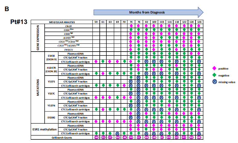 微小残留疾病(MRD)检测和监测对于实体瘤患者的管理仍然是一个巨大的挑战。根据肿瘤类型和分期的不同,相当多的癌症患者在原发肿瘤切除后五年内发生转移。在ER(+)乳腺癌症中,经过5年的辅助内分泌治疗后,乳腺癌症复发从5年到20年间持续稳定发生。这些乳腺癌症患者中,有很大一部分具有隐匿性微转移或MRD,在初始治疗后持续存在,这是随后远处转移复发的潜在来源。早期识别单个患者的MRD具有高度挑战性;为了实现这一目标,实时高灵敏度液体活检(LB)检测非常有前途,并为解决这一问题提供了巨大的潜力。 LB是一种微创方法,主要基于循环肿瘤细胞(CTC)和循环肿瘤DNA(ctDNA)的分析。LB是抗击癌症的重要工具,因为它能够实时监测连续样本中的肿瘤分子图谱。CTC分析目前是管理晚期和早期癌症患者的有力工具;尤其是CTC分子表征为更好地理解转移生物学和对特定治疗的耐药机制提供了独特的潜力。在癌症的早期阶段,CTC的检出率通常很低,并且具有高度的异质性。十多年来,在CellSearch系统中进行的CTC计数已被FDA批准为预后标志物,并与早期和转移性乳腺癌、转移性前列腺癌和结直肠癌的无进展生存率(PFS)和总生存率(OS)相关。除了CTC计数外,CTC在基因表达水平上的分子表征有可能阐明转移生物学中涉及的关键信号通路,甚至改善患者管理。RT-qPCR检测乳腺癌患者CTC中CK-19转录物在辅助化疗之前、期间和之后具有预后意义。CTC中PIK3CA的检测对患者的随访具有重要的临床应用价值。研究团队已经开发出高度敏感和特异的检测方法,用于检测早期和转移性乳腺癌患者EpCAM(+)CTC中PIK3CA热点突变(E545K,H1047R)和ESR1突变。 近日,一组来自希腊的研究团队在杂志Scientific reports上发表了一篇题为“Comprehensive liquid biopsy analysis as a tool for the early detection of minimal residual disease in breast cancer”的文章。在这项研究中,研究团队首次基于长期随访,对13名确诊为早期乳腺癌症的患者进行了全面的液体活检分析。分析基于CTC计数、CTC表型特征和CTC在基因表达、DNA突变和DNA甲基化水平的分子监测,以及相应的cfDNA突变和甲基化水平。结果表明,全面的液体活检分析为癌症患者的治疗管理提供了有价值和重要的信息,可以在出现临床可检测的转移性疾病和疾病进展之前几年揭示MRD的存在。 图片来源:Scientific reports 主要内容 一 CK-19 mRNA表达 在随访期间的不同时间点,评估了所有患者样本中CK-19转录物的存在(如下图)。在十年的随访中,十名患者未出现疾病进展,其中八名(8/10,80%)患者在所有时间点均未检测到CK-19转录物。另外两名患者(Pt#3、Pt#6)在1或2个时间点被发现CK-19转录物阳性。随访期间未出现疾病进展的所有10名患者中,仅在3/135(2.2%)个测试时间点检测到CK-19转录物。 相反,两名患者(Pt#11、Pt#13)在初始诊断后几年以及PD确诊和转移诊断前,CK-19转录本拷贝数显著增加。结果表明,在辅助治疗之前、期间和之后,在可手术乳腺癌症患者的外周血中检测CK-19(+)mRNA细胞是一个独立的预后因素,与疾病复发风险增加和生存期缩短相关。研究还表明,化疗完成后CK-19(+)CTC的存在与晚期复发风险增加和转移性乳腺癌生存率低相关。 EpCAM(+)CTC组分对CK-19 mRNA表达的分子分析。 图片来源:Scientific reports 二 DNA突变的检测 研究团队进一步分析了三名发生转移的乳腺癌症患者(Pt#11、Pt#12、Pt#13)血浆cfDNA和CTC-来源gDNA样本(如下图)。在所有测试时间点,发现Pt#12血浆ctDNA中ESR1突变均为阴性;该患者经历了内分泌治疗的临床客观反应,自诊断后61个月内,在分析时没有疾病进展。Pt#13在血浆ctDNA中ESR1突变呈阳性(如下图)。这名患者后来对内分泌治疗产生了耐药性。同时,PIK3CA突变分析结果表明,部分gDNA样品中PIK3CA热点突变呈阳性,为患者靶向治疗有着指导意义。 先前接受他莫昔芬或aromatase抑制剂治疗的患者中发现了ESR1突变,揭示了长期芳香化酶抑制治疗与ESR1突变的存在之间的可能相关性。获得性ESR1突变是芳香化酶抑制剂耐药性的主要机制。 P#11、P#12和P#13的CK-19、DNA突变、CTC计数和ctDNA的分子分析。图片来源:Scientific reports 三 Pt#13的综合液体活检分析 研究团队对Pt#13进行了综合液体活检分析。 CTC计数、表征和治疗干预:在随访期间,使用CellSearch系统在常规时间点进行CTC计数(如下图)。Pt#13CTC计数显示,即使在全身化疗开始之前,该患者的预后也很差,这是基于CTC数量相对较高。辅助化疗/放疗结束后,CTC数量都会有明显降低。根据CTC的表型表征进行一系列靶向治疗,CTC的绝对数量明显减少。在肝脏转移被组织学证实之前,患者的CTC持续阳性;CTC计数的急剧增加清楚地表明,在转移的影像学记录之前至少四年,疾病进展。 CTC计数结果(红星表示疾病进展的时间)。 图片来源:Scientific reports “ CTC和相应ctDNA的分子分析 CK-19 mRNA表达:在开始辅助化疗之前,在Pt#13的PB中未检测到CK-19转录物。患者肝脏转移确诊前8个月时,PB中观察到CK-19转录物。在疾病的转移阶段,所有CK-19转录物分析样本均为阳性。 DNA突变:转移的临床表现前一年,PIK3CA热点突变和ESR1突变在来自CellSearch的CTC来源DNA中,和在血浆cfDNA和EpCAM(+)CTC组分中连续检测到。在同一时间段,ESR1甲基化在血浆cfDNA和相应的EpCAM(+)CTC组分中检测到。这些结果表明,虽然CTC计数的增加表明转移扩散很早,但DNA水平上的CTC分子特征清楚地表明肿瘤已经对治疗产生了耐药性。 ESR1甲基化: 从EpCA