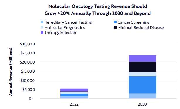 2022年12月,随着“动态清零”4个字的突然消失,一个月后新冠也在几乎全民感染后消失了,我们和全世界一样开始与新冠共存了,热闹又重回中国大地。 这一切对中国IVD企业来说是太突然了,从全民核酸检测变成了再也没有人做核酸了,遍布各个角落的核酸检测站似乎一夜间就蒸发了。 一场持续了3年的核酸检测盛宴就此结束了。 其实这场盛宴的结束不止发生在中国,全球IVD企业也在过去1年内陆续结束了新冠疫情检测带来的爆炸性增长。 01 — 中欧美IVD头部企业第四季度业绩惨淡 我们在HMC市场和临床Club中的第22期也有统计: 2月2日罗氏公布2022年第四季度季报,新冠检测销售额2022年Q4同比下降了58%,环比下降17%。 1月30日,西门子健康公布最新季报显示:新冠抗原在最新季度新冠检测营收大幅度下滑,为0.63亿欧元,同比下滑81%,环比下滑73%。 2月1号,赛默飞公布的2022年Q4新冠相关营收为3.6亿美元,同比下降85%,环比下滑18%,而2022年新冠相关的营收为31.1亿美元,同比下降超过60%(2021年为92.3亿美元)。 2月1号,Hologic发布第四季度季报显示:最新季度的1.27亿美元新冠检测营收,同比下降76%,环比下降16%。 美国最大的检测公司之一的Quest Diagnostics,2月2日公布了其2022年Q4季报及年报,其中该季度新冠检测营收达到1.84亿美元,同比下滑75%,环比下滑42%。2022年全年新冠检测营收为14.5亿美元,同比下降47.5%。 2月2日Becton Dickinson公布的最新季度新冠检测营收为3,100万美元,同比下滑83%,环比下滑16%。公司对2023年新冠检测业绩预测从1.25-1.75亿美元下滑到5,000万-1亿美元之间。 02 — 美国过剩的PCR仪出路在哪? 新冠核酸检测推动了全世界对PCR仪的需求,中国满大街核酸站背后是一台台在疫情期间多出来的PCR仪。据统计数据,在“动态清零”政策结束之前,中国有1.4万家医疗卫生机构可以开展核酸检测,15.3万专业技术人员从事核酸检测的技术工作。 美国也一样! 因为美国政府财政对新冠检测的大力度补助(最高时超过$200美元/每人),造成美国新冠疫情期间诞生了大量第三方CLIA PCR实验室,每个新增实验室都会购买至少1-2台的PCR仪。 根据上市公司的财报,可以发现: Hologic 2022年的PCR仪装机量几乎是疫情前的2倍。 Cepheid自2020年以来,Cepheid GeneXpert PCR仪的安装数量增加了一倍,达到近50,000个系统。 Quanterix-2021年PCR仪的装机量增长了32%到708台,疫情3年安装的数量从400台增加到2021年的708。 虽然Thermo Fisher没有公布其PCR仪的总装机量,我们知道美国开放式PCR仪市场是主要由Thermo Fisher 的7500,QuantStudioDx,和QuantStudio 5和7垄断。排名第4到10的厂家占有量和Thermo Fisher总量相差比较大。 1. 7500 2. QuantStudioDx 3. QuantStudio 5,7 4. ViiA 7 Dx 5. StepOne/ StepOne Plus 6. LightCycler 2.0/ 96/ 480/ 1536 7. Cobas 4800 8. SmartCycler 9. GeneXpert 10. Rotor-Gene Q 5Plex HRM System 这基本透支了美国未来5-10年PCR仪的市场容量,这些过剩的PCR仪有出路吗? 03 — 分子检测LDT市场 - 木头姐的大胆预测 近两年来在美国媒体和投资圈出尽风头的“女巴菲特”木头姐最近给出了一个大胆的预测,给全球过剩的PCR仪指出了一个方向,那就是分子检测LDT市场。 木头姐有超乎常人的信仰能力——即使在最困难的处境面前也绝不承认自己错了。她所管理的旗舰基金ARK Innovation ETF (ARKK)在2023年的第一个月强势反弹,一个月内上涨约44.4%,创造了这只基金历史上最大的单月涨幅。 所以木头姐1月30日的《Big Ideas 2023》预测报告格外受到关注,她对全球最新创新技术融合趋势进行了预测,覆盖13大创新领域,虽然大多数关注的是AI、比特币、电动汽车、航空航天等科技领域。生物科技有两个木头姐认为有突破性(Disruptive)发展的领域,其中一个就是分子诊断。 木头姐估计仅癌症分子检测美国的潜在市场就有950亿美元,其收入在未来8年内将以每年超20%的速度增长,从2022年的50亿美元增长到2030年的240亿美元。癌症分子检验公司的总市值将从2022年的300亿美元增长到2030年的1,450亿美元。 木头姐的《Big Ideas 2023》预测报告并没有给到整个分子检测的市场规模预测,分子检测除了癌症检测还包含了传染病检测,基因检测和血液检测等领域。根据市场调研机构Allied Market Research的报告,传染病分子检测的市场几乎是癌症检测的2倍。 按木头姐的大胆预测,分子检测的总市场在2030年将达到$960亿美金,其中大部分的收入将是在PCR检测设备和试剂,木头姐的这个预测比传统市场分析公司Meticulous Research的预测高了1倍。Meticulous Research最新对于分子检测市场的预测是每年按5.6%的复合比率增长,在2030年达到$466.9亿美金。主要增长原因来自于美国人口老年化,传染病和慢性病的扩展,医药治疗水平的提高,和检测便捷性提高等。 虽然木头姐的预测比较大胆,在美国科技股泡沫破灭前,曾经给投资人带来高额回报,她的旗舰基金ARK Next Generation Internet ETF (ARKW): 自从2014年成立后到2021年科技股泡沫破灭前以每年47%的复合收益增长,回报最高达时达到14倍。但是随着2021美国科技股的泡沫破灭,她也跌入神坛,ARKW最多时跌了80%。不过作者还是觉得木头姐的很多大胆预测还是有一定可信性的。 根据另外一家市场分析公司Allied Market Research的报告,分子检测除了PCR外还包含了其他5类不同的技术,包括了:DNA Sequencing、DNA hybridization,、微流控、分子等温扩增和其他。