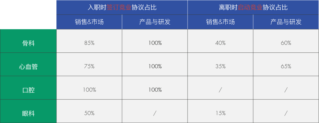 通常,劳动者离职后的竞业禁止义务是约定义务,不是法定义务。对于安迪这样被动离职(被裁员)的员工,有20%的企业不会启动“竞业条款”。而安迪此前的公司不在其中,他不得不为自己和家庭考虑其他办法。 *** 安迪只是一个侧影,Med+研究院对多家高值耗材企业“竞业协议”启动情况进行了细致调研,涵盖心血管、骨科等不同细分领域;总监级、经理级等不同层级人员,详情参见文末。在竞业期限内安迪都无法在骨科行业内找工作;为了先有一份工作,他只能被迫“转行”。