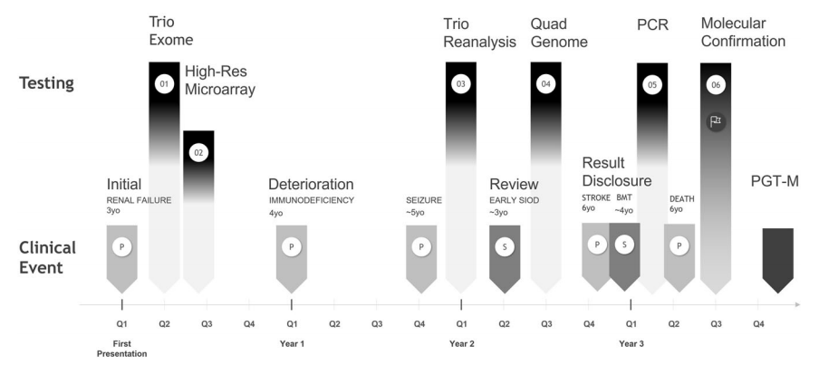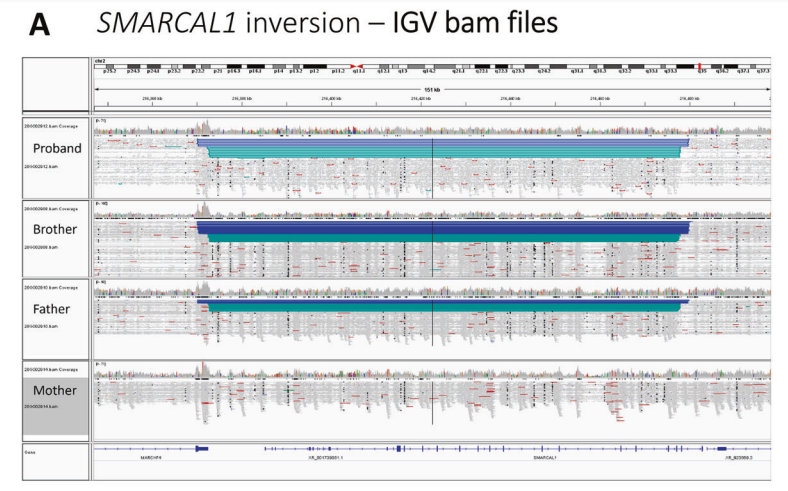 尽管估计80%的罕见病具有遗传起源,罕见病占住院人数的15.9%,但在50%以上的疑似遗传病患者中,分子诊断仍然难以实现。通常,罕见病的一线基因组研究仍然是外显子组测序,这是由于其相对便宜以及相对成熟的数据分析流程和变体解析。然而,一部分罕见病具有无法通过外显子组测序处理的分子病因,这就提出了其他技术(如短读和长读基因组测序、转录组和蛋白质组分析)应如何以及何时整合到诊断途径中的问题。 近日,一组来自澳大利亚的研究团队在杂志European Journal of Human Genetics上发表了一篇题为“Elusive variants in autosomal recessive disease: how can we improve timely diagnosis?”的文章,文章中,研究团队在照顾两个患有Schimke免疫性骨发育不良(SIOD)的姐弟俩的过程中反思了这个问题,即基因组测序、转录组和蛋白质组分析应如何以及何时整合到诊断途径中,才能达到对患者最有利最及时的诊断。 图片来源:European Journal of Human Genetics SIOD姐弟案例 研究团队在照顾两个患有Schimke免疫性骨发育不良(SIOD)的姐弟两个的过程中反思了一个问题,即基因组测序、转录组和蛋白质组分析应如何以及何时整合到诊断途径中,才能达到对患者最有利最及时的诊断。 这个案例中,尽管早期就获得了超快速外显子组测序,但对他们的分子诊断仍需3年(如下图)。先证者为一名3岁女性,表现为激素抵抗性肾病综合征和局灶性节段性肾小球硬化,迅速进展为终末期肾病。她参加了澳大利亚基因组学急性护理基因组学研究,并接受了超快速家系外显子组测序 (ultra-rapid trio exome sequencing),该测序检出了SMARCAL1中的一种可能致病性变体,该变体与常染色体隐性SIOD相关,报告时间为3.8天。在高分辨率染色体微阵列上未发现其他变异。她发展成免疫缺陷和骨髓衰竭,增加了SIOD的临床怀疑。与此同时,她的弟弟在3岁时出现了身材矮小、小头畸形和轻度蛋白尿,没有免疫缺陷。 时间线–姐弟俩的临床事件和诊断测试。 图片来源:European Journal of Human Genetics 基因组测序证实SIOD诊断 基因组测序在父母和两个受影响的姐弟中同时进行。对WGS数据的手动检查发现了父系遗传的2号染色体重排,包括SMARCAL1区域的疑似倒位。在推断的断点处通过PCR分析得到了进一步证实,最终在3年后在两个姐弟中建立了SIOD的确定的分子诊断(如下图)。 但对这位年长的姐姐来说,诊断来得太晚了,她在6岁时因SIOD并发症不幸去世。弟弟接受了症状前骨髓移植,结果良好。重要的是,分子诊断允许父母对两种SMARCAL1变体进行植入前基因检测,以实现未受影响的妊娠。 SMARCAL1的家族谱系和双等位基因变异。 图片来源:European Journal of Human Genetics 什么时候进行基因组测序? 决定一线外显子组测序还是基因组测序仍然是一个热门话题。像这样的案例突出了一线基因组测序的潜在效用,能够在一次测试中检测多种变体类型,从而显著缩短诊断时间,并提供潜在的医疗成本节约,同时有机会进行早期干预并改善临床结果。当已经进行了外显子组测序,但尚未进行诊断时,缺乏关于是否以及何时应将基因组测序视为第二级测试的指导,并且随之而来的是缺乏资金支持。 研究团队在这里强调了一组疑似常染色体隐性遗传疾病的患者,其中一条染色体的致病性变体已经被确定,特别有可能从基因组测序中获益。ABCA4相关的Stargardt病是一种相对常见的遗传性视网膜疾病,为识别常染色体隐性遗传疾病中缺失的遗传力提供了明确的模型。缺失的遗传力由一系列变异类型来解释,如新内含子剪接、顺式调控、结构变异等。将基因组学与下游定制功能研究相结合的综合方法不仅可以进行分子诊断,还可以为未来的个性化治疗提供机会。 涉及SMARCAL1的2号染色体倒位的检测和确认。 图片来源:European Journal of Human Genetics 怎样改善临床诊断结果? 这些研究说明了在寻求改善常规实践中的诊断结果时需要考虑的一些其他实际因素。拷贝数变异、结构变异和短串联重复需要专门的生物信息学分析进行检测,这些可能是或可能不是临床认可分析流程的一部分。即使检测到,这些变体类型也更可能需要定制设计的正交验证。由于缺乏确定这些变异是否致病的指导,临床解释仍然具有挑战性。例如,gnomAD和DGV等人口数据库目前用于结构重排的数据有限。变体分类指南,包括ACMG/AMP可能不适用于这些变体类型。这可能会导至分类为具有不确定意义的变体,需要辅助研究(包括RNA研究)来确定下游效应和致病性。需要在常规诊断环境中建立有效检测、验证和解释一系列变异类型的途径,以及时、经济高效地实现诊断。 未来 诊断基因组学的未来进展有可能进一步改变实现分子诊断的能力。PacBio和Oxford Nanopore等长读测序技术的持续发展,以及端粒到端粒(T2T)基因组的未来实施,有可能解开迄今无法解释的基因组的大部分,包括复杂的重排、重复片段和着丝粒周围区域。在未来,弥合技术和转化差距无疑将对罕见病诊断的及时性产生重大影响。 |