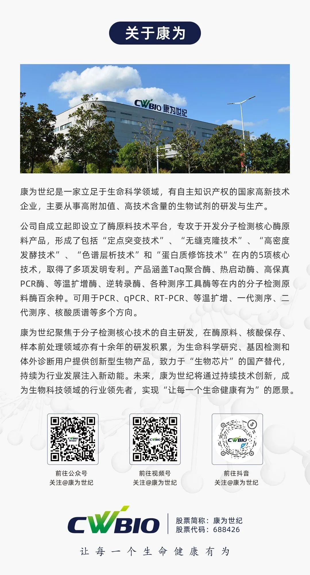得从源头上避免RNase污染 从源头上避免RNase污染十分必要,一方面要严格控制外源性RNase的污染,另一方面要最大限度地抑制内源性的RNase。 控制外源性RNase污染的方法 1. 操作人员全副武装 手套戴戴好,帽子戴戴好,当然还有现在的社交礼仪必备——口罩戴戴好。 在实验过程中戴手套可避免源自人手的RNase污染;触摸皮肤、门把手及普通物体表面后更换手套。 2. 使用专业仪器与试剂 RNA操作专用的移液枪;使用RNase-free的枪头和离心管;使用RNase-free的化合物与试剂 3. 选择实验操作环境 远离/遮蔽通风孔或开放窗口,走动较少的区域作为RNase-free区域 4. 其他注意的点 在RNA提取、逆转录、一步法qPCR等涉及到RNA相关的实验中,不要进行其他可能引起RNase 污染的实验操作。 5. 添加RNA酶抑制剂 在RNA提取后的产物中立即加入RNA酶抑制剂,第一时间避免外源性的RNase来水解RNA样本。 抑制内源性RNase活性的方法 样本保存 组织取样后若不直接提取RNA,要及时液氮迅速冷冻存于-80°C环境,并尽早进行实验,这样可使RNA的降解尽量降低。 但同时也有风险,解冻时,温度一旦达到RNase的酶活温度,珍贵的RNA样本就又会面临被RNase水解的命运,真的是心累呀~~ 因此这步就必须要使用RNA和DNA保存液来保护样本,抑制内源性RNase。(推荐康为世纪CW0592) RNase抑制剂可有效避免RNase污染 RNase抑制剂是一种特异性RNase抑制剂,能够特异地与RNase以非共价键结合形成复合体,造成RNase失活,从而保护RNA的完整度。 康为世纪 高品质RNase抑制剂 康为世纪RNaseOff™ RNase Inhibitor是以可溶形式在大肠杆菌中表达纯化的重组RNase抑制剂,能够广泛抑制各种类型RNase(RNase A, B, C)可用于RT-PCR/RT-qPCR,解决体外转录中RNA降解问题,抑制RNA分离纯化过程中RNase的活性。 康为世纪作为专业的分子诊断原料酶生产商,一直致力于分子相关原料的创新及开发,康为世纪新推出的 RNaseOff™ RNase Inhibitor是冻干粉形式,可常温运输,性能稳定。 RNaseOff™ RNase Inhibitor可渗透RNA实验的每一个细节,将RNA所有相关实验中的RNase开关关闭 。见证您RNA相关实验的每一次成功。 产 品 简 介 广谱的RNase抑制活性 可抑制包括RNase A、RNase B、RNase C等在内的RNase。 兼容广泛的反应条件 在pH 5.0-9.0条件下和25℃至60℃的温度下都具有活性,适用于热稳定型逆转录酶(40℃-60℃)。 兼容广泛的下游实验 对SP6、T7或T3 RNA聚合酶,AMV、M-MLV逆转录酶和Taq DNA聚合酶酶活性无影响。 规模化量产、超高性价比 单次生产达35亿U,确保了产品的均一性、稳定性和供货的及时性,有利于成本控制。 批间稳定性 成熟的蛋白表达和纯化平台,符合ISO13485质量管理体系,根据质量标准进行质控检测,保证批次间产品的稳定性。 应 用 场 景 产品订购信息