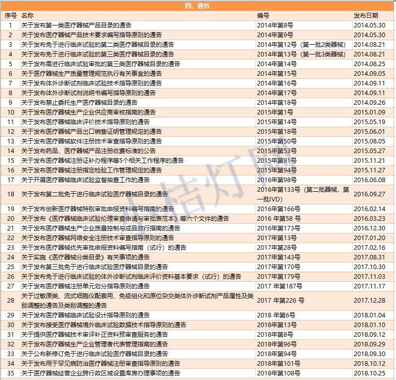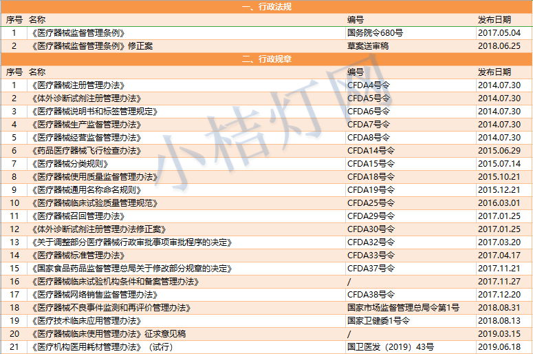 最新汇总指路:https://www.iivd.net/article-23792-1.html 自新版《医疗器械监督管理条例》(国务院令第650号)于2014年6月1日起实施以来,其配套规章及规范性文件陆续出台,大部分于2014年10月1日起正式实施。 以下是国家食品药品监督管理总局已经发布和正在征求意见的系列法规文件,小桔灯网整理如下: |