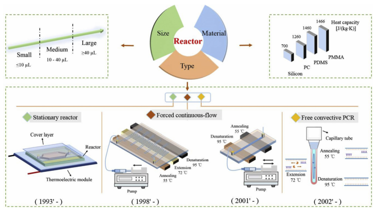 图 1 当面对具体的核酸检测需求时,对样品裂解、核酸提取和扩增检测方法的合理选择与组合,需要统筹考虑众多因素,如样品类型、样品体积、待分析核酸的来源(人的细胞、细菌、病毒等)、脱氧核糖核酸(deoxyribonucleic acid, DNA) 或是核糖核酸(ribonucleic acid, RNA)分析、检测灵敏度、检测靶标数目等。 没有一种单一固定的方法可以适用所有类型样品的核酸检测。 一、样品裂解 样品裂解是核酸分析的第一步。破坏包裹在核酸外的细胞膜或细胞壁,释放核酸的方法主要包括化学裂解、机械裂解、电裂解和热裂解等方式。 1.1 化学裂解 化学裂解依据裂解样品和细胞的类型而选择对应的化学物质,如用高离液盐、碱溶液、表面活性剂、蛋白酶 K、溶菌酶等,来溶解破坏细胞膜或细菌壁。 图 2 化学裂解操作简单、条件温和,不需要复杂的配套仪器,但是在后续的核酸提取过程中往往需要清除裂解液中抑制扩增的物质。 1.2 机械裂解 机械裂解是利用机械作用力(剪切力、震荡力、研磨力等),对细胞结构的直接破坏来释放细胞内物质的方法。超声破胞、微珠研磨等都属于机械裂解释放核酸的有效方法。 图 3 其特点是效率较高、速度快,能非特异性地裂解所有细菌细胞且可不引入影响后续扩增的化学试剂,免除了后续清除的麻烦,尤其对于难以破胞的细菌、真菌更是最佳的选择。 1.3 电裂解 电裂解是指利用高强度电场使细胞膜表面产生不可逆孔洞,从而释放胞内物质的方法。 当外界电场施加在细胞上,细胞膜会产生跨膜电压,当该电压超过一定的阈值时,细胞膜就会产生不可逆的损坏,导至细胞的裂解。 图 4 宏观尺度的电裂解需要在样品中直接施加高电压,微观尺度的电裂解需要借助微电极产生的电场作用于细胞上。 电裂解缺点在于电极的工作寿命短,高电压可能导至水解、局部过热以及蛋白变性。 1.4 热裂解 热裂解是通过反复冻融细胞,在细胞膜上形成冰晶,破 坏 细 胞 膜 从 而 释 放 胞 内 核 酸 的 裂 解 方式。这种方法比较耗时,操作繁琐。 图 5 热裂解的另一种方式是利用高温(90-100 ℃) 使细胞壁或细胞膜的蛋白变性,从而破坏细胞。 二、核酸提取纯化 核酸的提取与纯化是为了保证样品中的核酸完整性与纯度,使后续的核酸扩增反应可以顺利进行。 核酸提取方法大致可分为液相提取与固相提取。 2.1 液相提取 液相提取主要有苯酚-氯仿法。苯酚氯仿与样品经过激烈的混合和离心后,生物样品中的蛋白质被苯酚氯仿变性并被萃取到下层的有机相而核酸分子则被保留在上层的水相中。 图 6 该方法由于使用了有毒挥发性有机试剂,对实验者健康有较大影响,因而已逐渐被其他核酸提取方法所取代。 2.2 固相提取 固相提取按照原理分类主要有三种技术方法:凝胶过滤、基于电荷可逆吸附的离子交换色谱法和基于可逆表面吸附的亲和色谱法。 这些方法都能与离心柱或色谱柱结合,后两种方法还能够结合到微珠表面。 凝胶过滤方法的原理:依据核酸分子能够通过特定孔径大小的凝胶,而小分子则会滞留在孔中的特性。交联葡聚糖及其衍生物是最常使用的基质。这种方法无法分离和核酸分子尺寸相近的分子。 离子交换色谱方法的原理:带负电的核酸分子可选择性地结合到被游离平衡离子包围的带电基团表面,未结合的杂质被清洗掉,随后通过大量的游离离子取代核酸分子,与带电基团表面的结合,来释放核酸分子。二乙基氨基乙基纤维素是常用的阴离子交换树脂。 基于可逆表面吸附的亲和色谱法的原理:在高离液盐或高浓度醇的酸性环境中,带负电核酸分子与带负电硅基表面会因高离子强度和氢键而吸附结合;当去除高离液盐或是醇的环境后,核酸会被释放。 图 7 该方法用于核酸提取通常分为四步:裂解、结合、清洗和洗脱。亲和色谱法无需使用有毒试剂,对实验操作人员的伤害少,且操作简单、用时短。 三、核酸扩增 待检测样品中的核酸物质含量通常较低,只有通过核酸扩增才能达到被特异性检出的水平。 核酸扩增技术根据工作温度的不同可分为变温扩增、等温扩增。此外,近年来有别于单一腔体中的扩增技术,数字扩增技术备受亲睐。 3.1 变温扩增 变温扩增技术主要是指PCR。 图 8 3.2 恒温扩增 恒温扩增技术利用生物体的DNA或RNA合成酶,无需温度循环即可实现核酸的扩增,如LAMP、RCA、HDA、RPA等。 图 9 典型的核酸等温扩增技术特点及产物检测方式 3.3 数字扩增 数字扩增是将核酸样品分散到成千上万个独立隔绝的空间中进行大规模的平行核酸扩增反应,然后含有目标核酸片段的微反应空间会经扩增得到荧光信号。 最终通过直接计数或泊松分布公式即可对原始样本的核酸数进行计算。 图 10 四、扩增产物检测 在核酸扩增过程中或完成扩增后,检测扩增产物的量是获取靶标核酸信息的重要步骤。 图 11 常见的核酸信号检测技术有光学检测、电化学检测等。可以根据实验或者诊断的需求选择合适的产物分析技术,从而完成核酸检测。 [1] 便携式全集成核酸分析系统技术综述 免责声明:文章内容仅供参考,不构成投资建议。 |