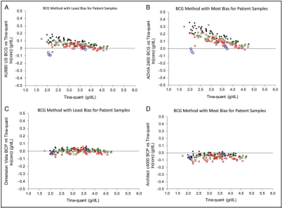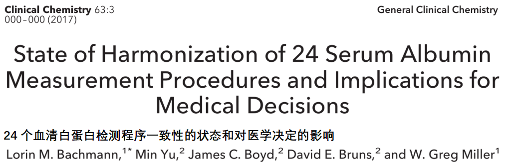 CC的白蛋白检测问题 冯仁丰 背景:血清和血浆白蛋白的检测被广泛地用于医学,包括在肾透析中心中病人护理质量的指示。 方法:收集没有肾病病人的血清(n = 50)、血浆(n = 48),肾衰病人血液透析前的血清(n =53)例。所有样品和ERM-DA470k/IFCC参考物质(RM),以3个免疫化学、9个溴甲酚绿(BCG)、和12个溴甲酚紫(BCP)方法检测。 结果:3个免疫化学程序的2个、9个BCG的5个、和12个BCP的10个方法,回收的RM值在它的不确定度内。一个免疫化学和3个BCG方法相对于RM值有偏移。所有检测程序的随机误差成分很小。选定Tina-quant免疫化学程序为参考检测程序,这是依据回收率和误差分析结果。BCG对于Tina-quant的平均偏移为1.5%到13.9%,在较低白蛋白浓度处更大。BCP方法的平均偏移为-5.4%到1.2%,无论白蛋白浓度。在所有方法类型中,血浆样品的偏移一般高于血清样品。对大多检测程序,进行血液透析病人相对于无肾病病人的血清,偏移较小。 结论:在免疫化学、BCG和BCP间显著差异,影响了血清白蛋白结果的解释。在临床管理肾病和其他疾病的指导和计算,必须考虑进行白蛋白检测的方法,直至实现一致性。 讨论 检验医学溯源性联合委员会(JCTLM)列出了依据免疫检测原理的透射比浊或散射比浊原理,去检出免疫复合物作为血清中白蛋白的一个RMP(20)。ERM-DA470k/IFCC被列为免疫检测校准的一个认证 RM。我们使用Tina-quant透射比浊免疫化学检测程序作为RMP,去确定检测程序和样品类型间的相对偏移,因为它在RM中具有出色的白蛋白回收,和很小的随机误差成分。在其他2个免疫化学方法间,Immage散射程序具有与Tina-quant详细的性能,但BN II对于RM值和Tina-quant程序,在所有样品类型中有显著的正偏移。这些观察隐含了BN II的校准是不正确的,使用一个免疫化学检测原理不可确保白蛋白的准确结果,除非校准溯源性被验证。 一般,BCG方法与BCP方法相比有较高的偏移。BCP方法对于RMP的平均偏移较小,并比例误差的大小不随浓度改变。相反,BCG方法对于RPM的平均偏移较大,呈比例误差随白蛋白浓度而异,在白蛋白较低浓度处有较大的正偏移。另外,在BCG方法与BCP方法间的比较,有较大范围的差异,说明BCG方法在很大程度上被其他样品中的蛋白或物质影响,超过BCP。 依据生物变异指标,在整个生理上合理的浓度范围,没有一个BCG方法符合偏移的最低性能规范。但12个BCP方法的8个符合了偏移的最低性能规范,没有这样的BCP方法的偏移通常比BCG方法观察到的要小。我们的数据说明,BCP方法对白蛋白有较好的选择性,具有比例偏移,看来结果的一致性可以达到。但是BCG方法随浓度变异的偏移和非选择性,隐含了实用BCG技术不可被一致,应从临床实验室中消除。 使用肝素处理的血浆的检测,在BCG方法中产生错误结果,已在以往报告中观察到(24,25)。本研究的的所有检测,除了Immage散射程序外,均被美国FDA批准,可使用血清和肝素化的血浆样品。我们的观察建议,特异性问题与肝素化样品有关,将继续是近期产生的BCG方法的问题。 24个检测程序中的19个,声明具有校准溯源性到ERM-DA470k/IFCC或它predecessor的ERM-DA470血清的RM。在实施校准溯源性做法中的差异,看来归因于偏移。但是肾病的还是非肾病的在血清或血浆间,结果的差异也支持了白蛋白方法,作为suffering因选择性的局限性,在样品类型间也不同。 血清和血浆白蛋白使用染料技术实现一致的结果,将要求规定单一试剂类型。我们的数据支持BCP作为优选的方法,因为相对偏移小于BCG方法,并在整个检验的浓度区间是恒定的,但BCG方法在整个浓度区间不呈比例的偏移,使得标准化不可能。 所有BCP和9个BCG方法的6个,回收ERM-DA470k/IFCC RM靶值很相似。病人样品和未稀释的和稀释的RM,免疫化学的和BCP对于RMP结果,具有类似的关系,看来RM适合用于这些方法。但是,稀释的RM结果在BCG方法,具有值得注意的不同关系,所以,稀释的RM会在BCG方法中,与病人样品不可互换。我们不知道,在校准溯源性方法中稀释了RM被厂商使用;如果使用了稀释的物质,BCG方法具有了互换性的问题。原先预期使用RM分析证书声明是,为校准免疫检测程序,包括关于对染料结合方法的minimal信息,建议了对特定检测程序使用应予以确认。需要进一步研究去确定RM为染料结合白蛋白检测程序的互换性特性。 白蛋白检测程序偏移的差异对病人诊疗有影响。美国的国家肾脏基金会关于慢性肾衰竭的营养指南(The National Kidney Foundation’s guidelines on nutrition in chronic renal failure) 建议进行肾透析病人的白蛋白常规检测(11,26)。在美国的Medicare和Medicaid服务中心,设定了透析病人护理的标准(27)。与前述指导(11)一致,目标(28)是:使用BCG方法检测的(或以BCG方法为(实验室正常的))白蛋白浓度≥ 4.0 g/dl(40 g/L)。 2016年,透析中心被预期,在38%治疗病人中达到白蛋白高于40g/L(29)。对血清白蛋白<35 g/L的病人,中心必须说明证据,计划改善营养。对于病人白蛋白低于该指导值的,应aggressive强烈补充蛋白(30)。补充会不利地影响无机磷、钾、和其他电解质,补充的费用和个人的时间通常nonreimbursable,还没有说明对明确的死亡率好处(31,32)。白蛋白检测没有标准化,使大量透析病人遭受未被证实和耗费治疗的风险。 白蛋白检测程序的选择,肾病样品百分数上产生了很大的差异,与本研究目标一致。BCG方法间,白蛋白目标是≥ 4.0 g/dl(40 g/L),以Advia 2400检测,有32%的样品符合,但以Architect 
