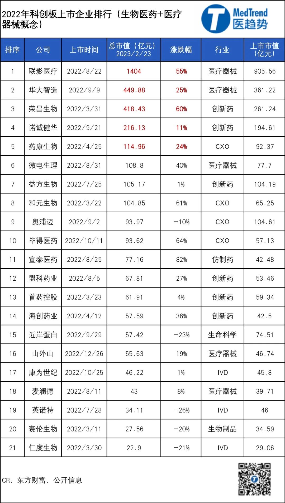 总的来看,科创板、创业板都是医疗创新企业的热门板块,尤其是科创板,明确指出上市企业应属于生物医药等六大领域,所以“吸引力”更强——从2019-2022年,科创板注册制下,共有近100家医健概念股上市;创业板2020-2022年仅有近40家。 从本质来看,IPO发行制度的改革其实与经济发展阶段息息相关,制造业时代,要求四平八稳,审核制可以过滤掉风险企业。而科创时代,企业发展更加不确定,开放资本市场,其实是对科技公司最好的扶持办法。 破发、退市成常态,重新认识游戏规则 沿着科创板、港股的经验,注册制对于行业的影响有迹可循。 全面牛市成为过去时,行业分化加剧 从科创板经验看,试行注册制以来,行业正在发生结构性分化,几乎不可能再出现全面性牛市。 总的来看,21家企业目前整体市值近3600亿元,多数企业上市以来市值上升,头部企业市值增长明显高于底部企业,强者恒强,龙头企业更受追捧。 分板块来看 创新药是过去一年登陆科创板的医疗企业中数量最多的,达6家,其中只有2家市值超200亿,也是为数不多的实现两位数增长的创新药公司。截至今日午盘