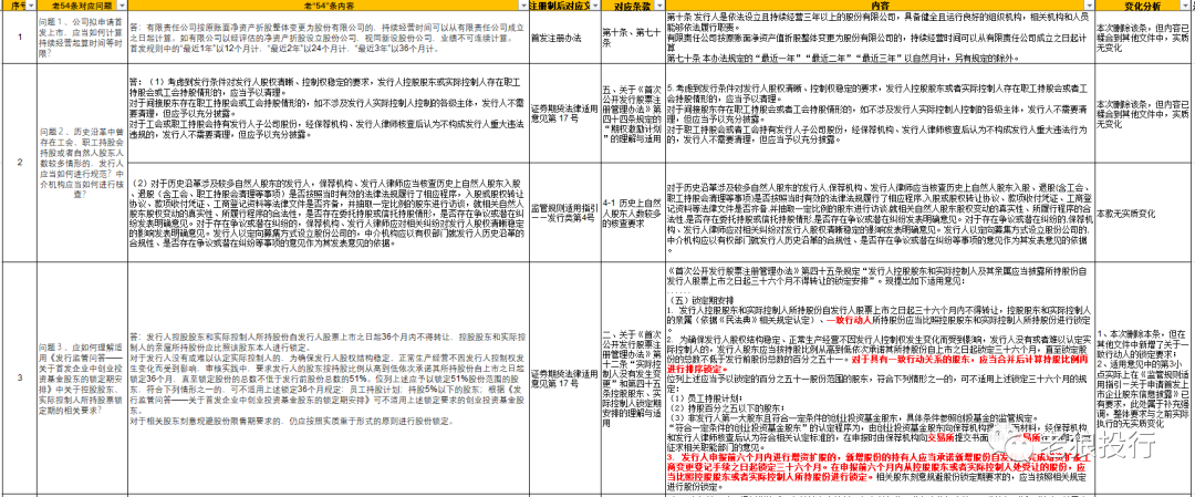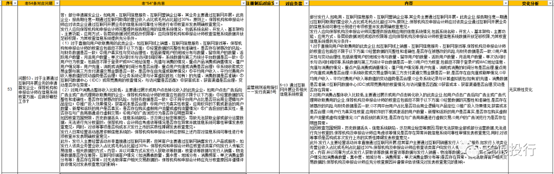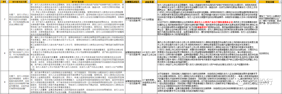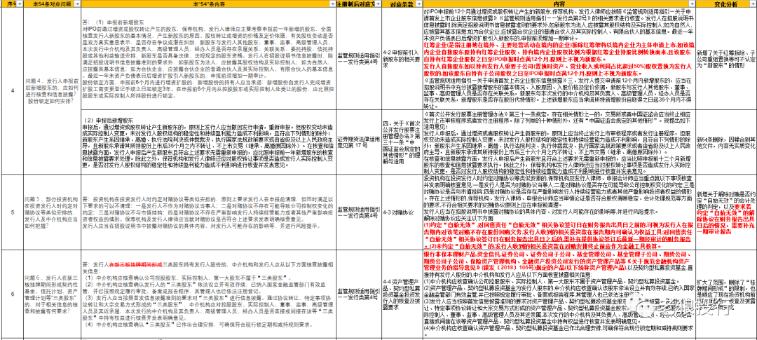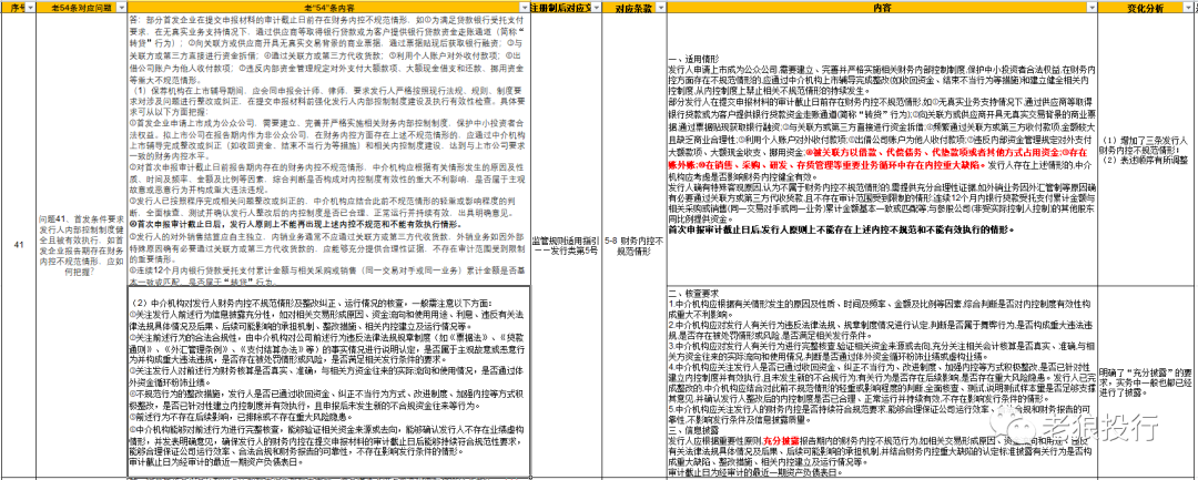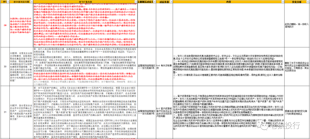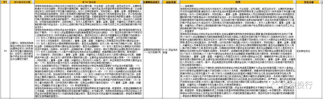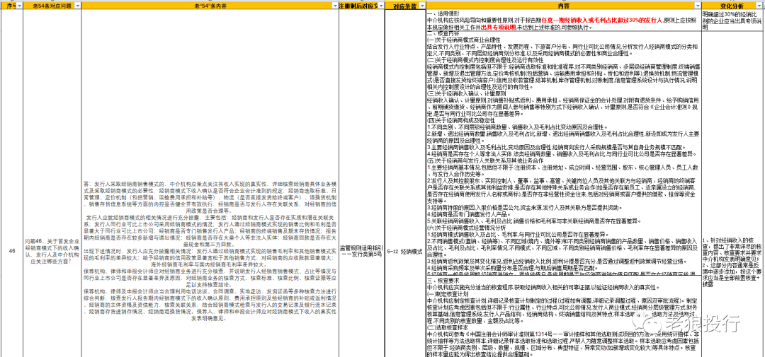 【前言】对投行从业者来说,老“54”条实在太过深入人心,非常有必要以老“54”条为准绳,逐条对比其中的差异,并将简化及删除的内容具体糅合到其他文件的出处也做个详细地阐述。本次修订,也体现了一些目前的审核重点: (1)紧跟注册制强调信息披露、强调针对性和重要性原则的原则,三大板块的规则进行了更新整合,部分较老的监管问答进行了与时俱进的修订; (2)整体的内容较原先进行了精简,部分简单重复或会计准则规定较为明确的简单问答内容进行了删除,如原问答27关于建筑企业工程施工的问题、问答29关于存货减值的问题等;部分已有相关文件规定的内容也进行了删除,如问题36关于主营业务3年内未变更的要求,实质已在《证券期货法律适用意见第3号》中进行了规定; (3)细化了经销业务核查的具体要求,新增的文字篇幅较大; (4)对一些财务处理实务中不够明确的问题进行了细化,比如股份支付的确认、等待期问题等。希望作者此文能对各位看官有所助益,不胜欢喜。 |